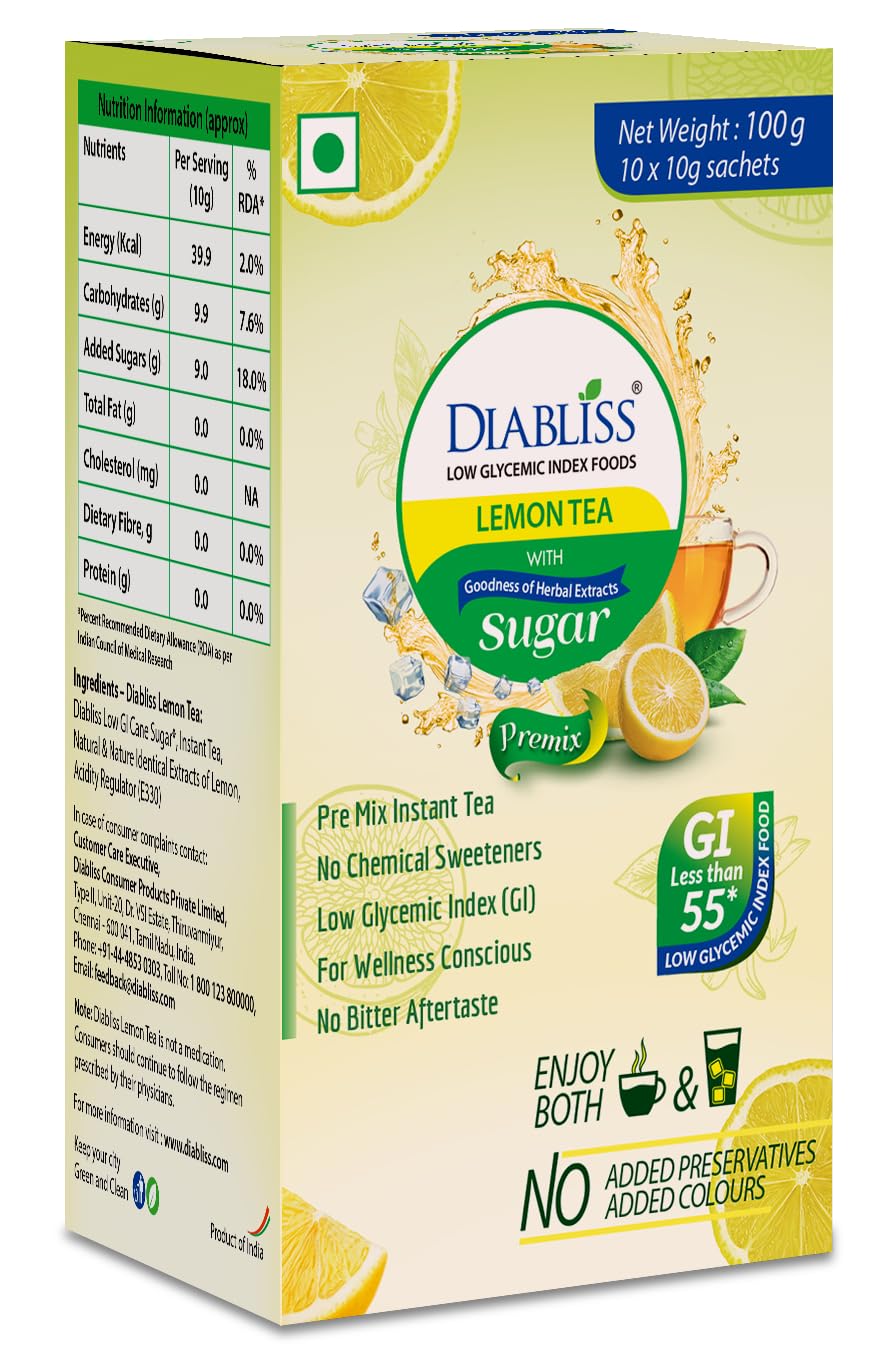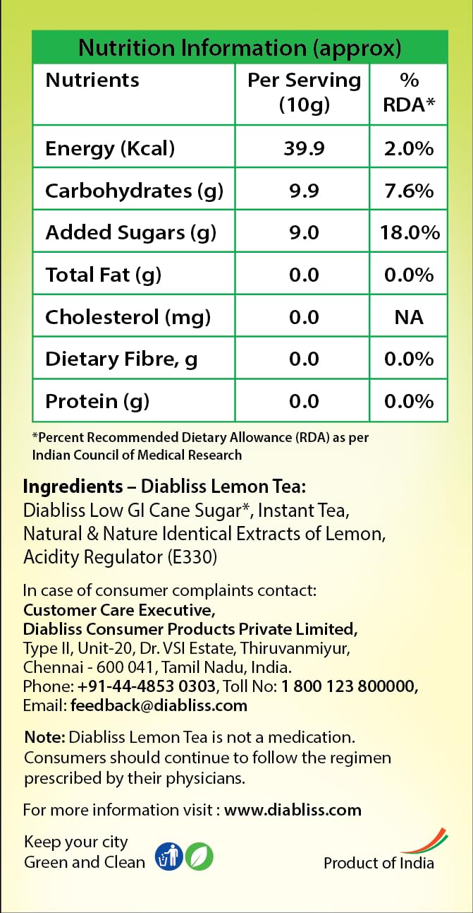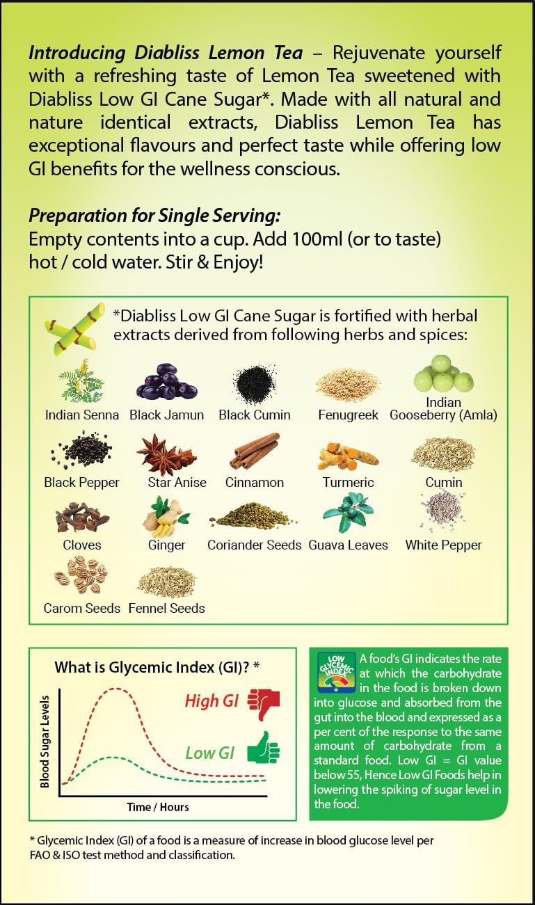 Low-GI Formulation: Diabliss Herbal Lemon Tea is carefully crafted without refined sugar or artificial sweeteners making it a mindful choice for those looking to manage their sugar intake. With a low glycemic index (GI) of less than 55 it offers a refresh