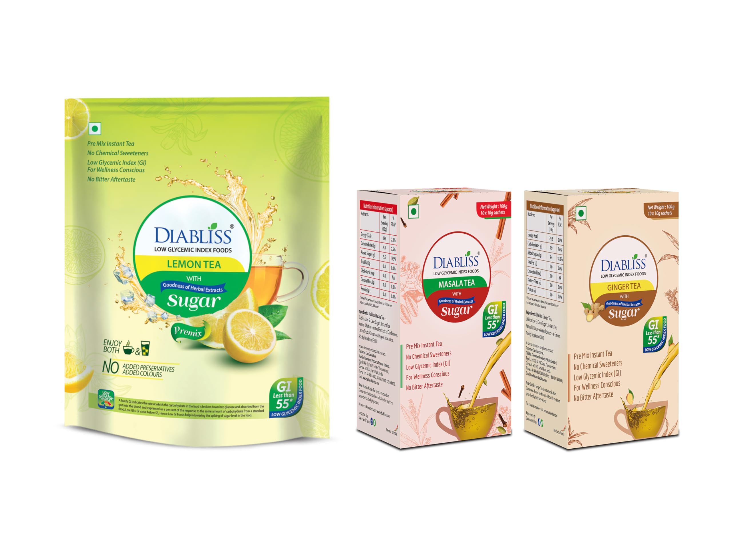 Diabliss Tea Premixes Combo - Lemon Tea 500g Pouch Ginger & Masala - Each 10 x 10g Sachets. Instant Tea For Wellness Conscious