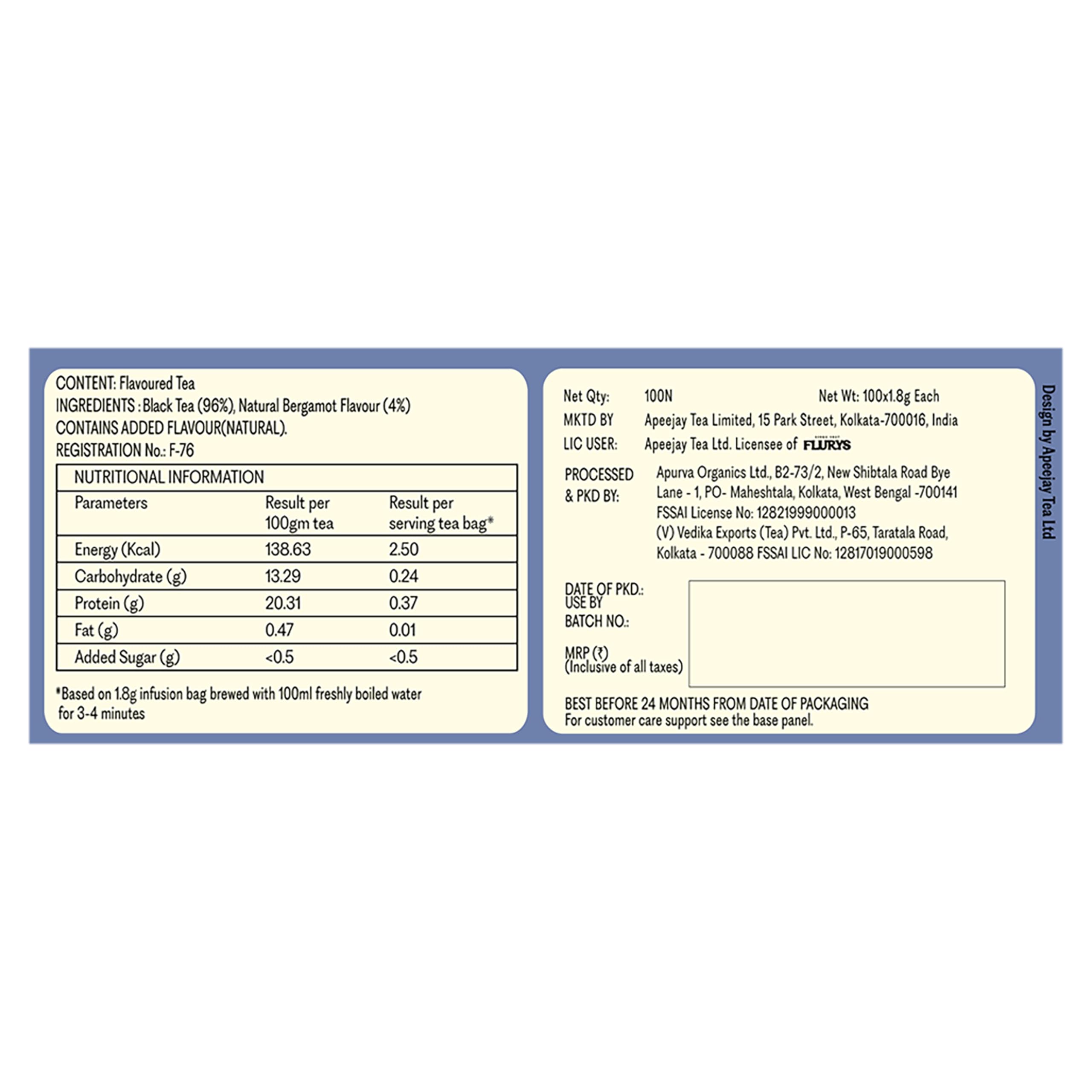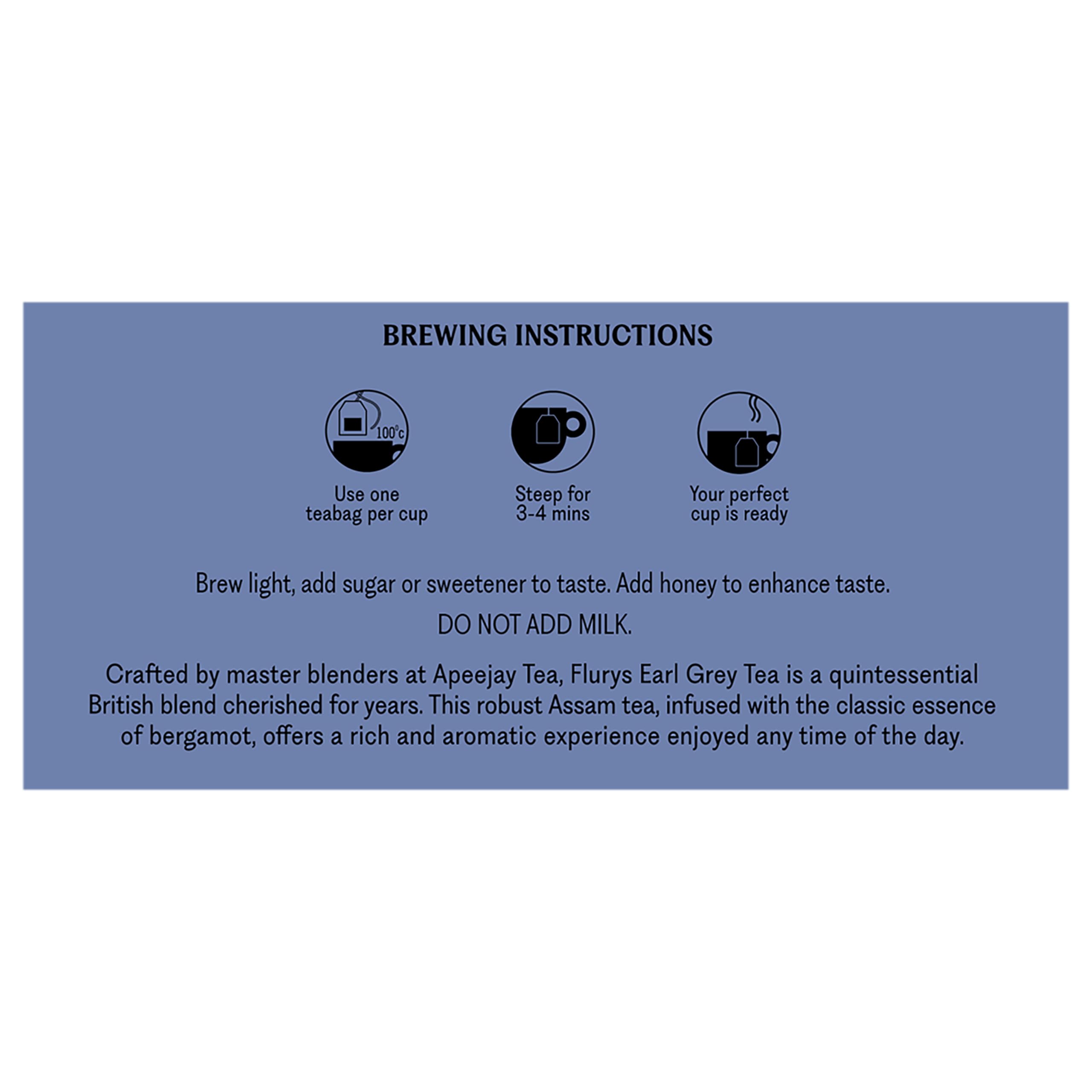 Flurys Classic Earl Grey Envelop 100 Tea Bags 180 Grams