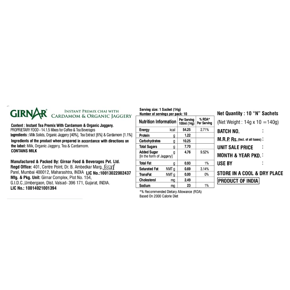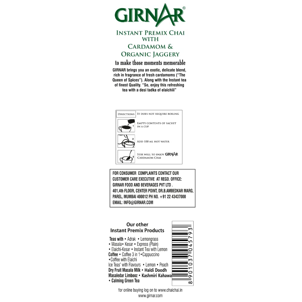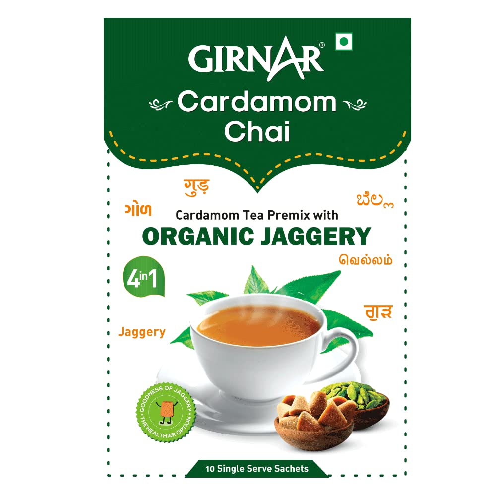 Indians boast of Chai thanks to the Queen of England; Indians boast of Cardamom Chai thanks to the Queen of Spices! From the Queen of England to the Queen of Spices (Cardamom/Elaichi) Indian Chai has been through a long journey. But you know the journey has been worthwhile when the outcome is Cardamom Chai. This is a premix of Strong chai with a delicate but refreshing Cardamom flavour and Organic Jaggery. Girnarâs Cardamom Chai with Jaggery is a royal blend that appeases your nose buds and your taste buds without sacrificing on that hidden sweet tooth! ~ 4 am or 4 pm In the valley or amidst the clouds Sailing or Flying Homely cuddles or solo travel: Ghar-jaisi-Cardamom Chai with Organic Jaggery can now be made just by adding hot water to this premix! No wonder coming back home is not necessary to feel at home. ~