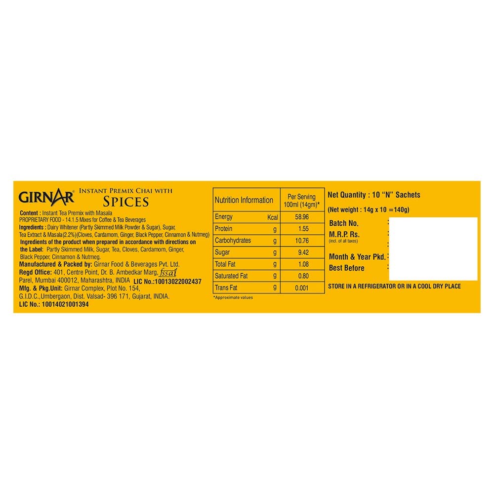 When the British introduced tea in India Desi Chai was born; When Chai was introduced in an Indian home Masala Chai was born. And when Masala Chai Premix was introduced by Girnar Instant ghar-jaisi-chai was born. Girnar’s Masala Chai Premix is a ready-made (pre-mixed)powder of robust Desi Chai complemented by the stimulating flavour of Cardamom Cloves Black pepper and Ginger; finished with the subtlety of Cinnamon and Nutmeg.