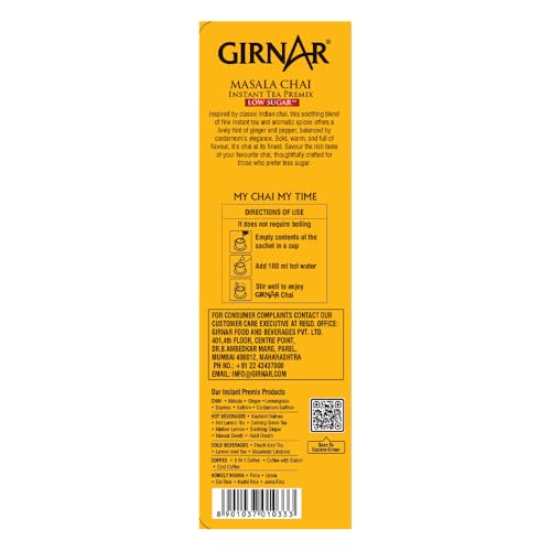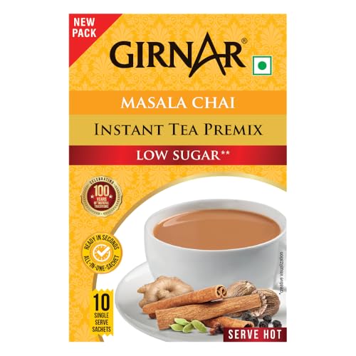 Size: 10 Sachets (Low Sugar) When the British introduced tea in India Desi Chai was born; When Chai was introduced in an Indian home Masala Chai was born. And when Masala Chai Premix (low sugar) was introduced by Girnar Instant ghar-jaisi-chai for the sugar-conscious was born! Girnarâs Masala Chai Premix is a ready-made (pre-mixed) powder of robust Desi Chai complemented by the stimulating flavour of Cardamom Cloves Black pepper and Ginger; finished with the subtlety of Cinnamon and Nutmeg. This is the low sugar variant of our much-loved Masala Chai Premix. Cut down on sugar not your favourite Chai! 4 am or 4 pm In the valley or amidst the clouds Sailing or Flying Homely cuddles or solo travel: ghar-jaisi-chai with low sugar can now be made just by adding hot water! No wonder coming back home is not necessary to feel at home..
