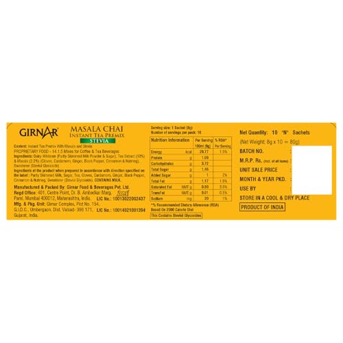 When the British introduced tea in India Desi Chai was born; When Chai was introduced in an Indian home Masala Chai was born. And when Masala Chai Premix with Stevia was introduced by Girnar Instant ghar-jaisi-chai for the sugar-conscious was born! Girnarâs Masala Chai Premix is a ready-made (pre-mixed) powder of robust Desi Chai complemented by the stimulating flavour of Cardamom Cloves Black pepper and Ginger. It finishes with the subtlety of Cinnamon and Nutmeg and mild sweetness lent by the Stevia leaf extract. For those who maintain a safe distance from sugar: this Premix contains Stevia a natural leaf sweetener with a non-glycemic response. Simple pleasures just got sweeter! ~ 4 am or 4 pm In the valley or amidst the clouds Sailing or Flying Homely cuddles or solo travel: ghar-jaisi-chai with Stevia can now be made just by adding hot water! No wonder coming back home is not necessary to feel at home. ~
