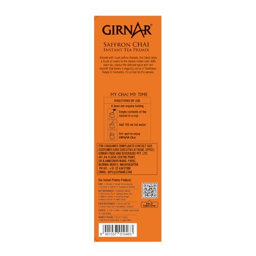 Girnar bring you an exotic blend of Instant tea extract and Saffron (Zaffran) termed as "Golden spice" that hails from the land of Arabia making it one of the most expensive spices in the world. Saffron lightens complexion gives your skin a nice glow & warmth to the body. Hope you enjoy this ease of instant tea with the golden touch of Saffron.