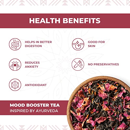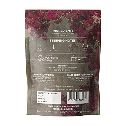 A perfect mood booster! Made with enchanting Rose petals Holy basil and a touch of cardamom. Rose petals have a uplifting flavour and coupled with fresh green tea and tulsi the tea is truly a mood booster Tea benefits: The tea is Calming a Mood Booster & Helps with Immunity and Cleansing. Tea profile & steeping notes: The pleasant lifted notes of rose comes with the briskness of green tea. Ideal brew time is 3 minutes at 80-95°c Pack contains: 50 gms loose which will make 25 cups (approx 2 gm per cup).