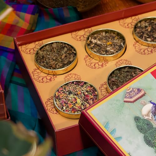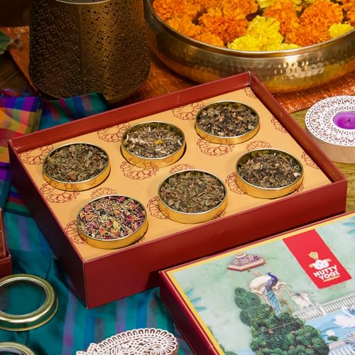 Nutty Yogi Wellness Tea Box Gift Hamper - Festival Gift | 6 Assorted Teas Gift Box with Brass Tea Strainer | Rose Petals Tea 50g | Anti Allergy Tea 50g | Ayurvedic Masala Tea 100g | Calm Tea 50g | Energy Tea 50g | Immunity Tea 50g