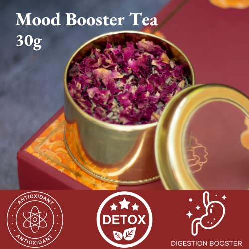 ASSORTMENT CURATED BY NUTTY YOGI- 2- Mood Booster Tea - A perfect mood booster! Made with enchanting Rose petals Holy basil and a touch of cardamom. Rose petals have an uplifting flavour and coupled with fresh green tea and tulsi the tea is truly a mood b