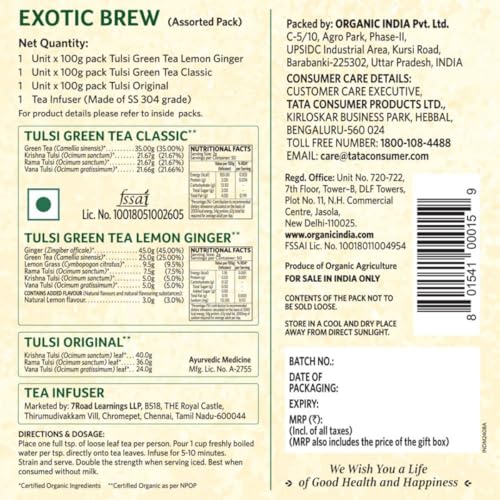 Elevate your tea-drinking experience with our exclusive Tulsi Green Tea – Exotic Brew Gift Box SetThis thoughtfully curated collection of three exquisite Tulsi tea varieties will delight the senses soothe the soul and make for a perfect gift for tea enthusiasts and wellness aficionadosCrafted with love and care each tea blend in this eco-friendly gift box is brimming with the natural goodness of Tulsi (Holy Basil) & green tea and is a testament to the serenity of natureThis box come with the 3 different varieties of Tulsi green Tea Lemon Ginger Tulsi Green Tea Classic Tulsi Original tinIndulge in the world of Tulsi with this exclusive gift box setEach tea blend is a testament to the remarkable synergy of nature and wellnessMake wellness a part of your daily ritual or share the gift of well-being with someone special.