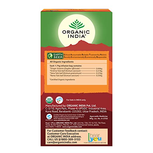 A TATA Product - Organic India Tulsi Ginger - 25 Tea Bags, Rich in Antioxidants, Supports Digestion, Stress Relieving, Helps Boost Metabolism, Caffeine-Free, Whole Herbs Certified Organic