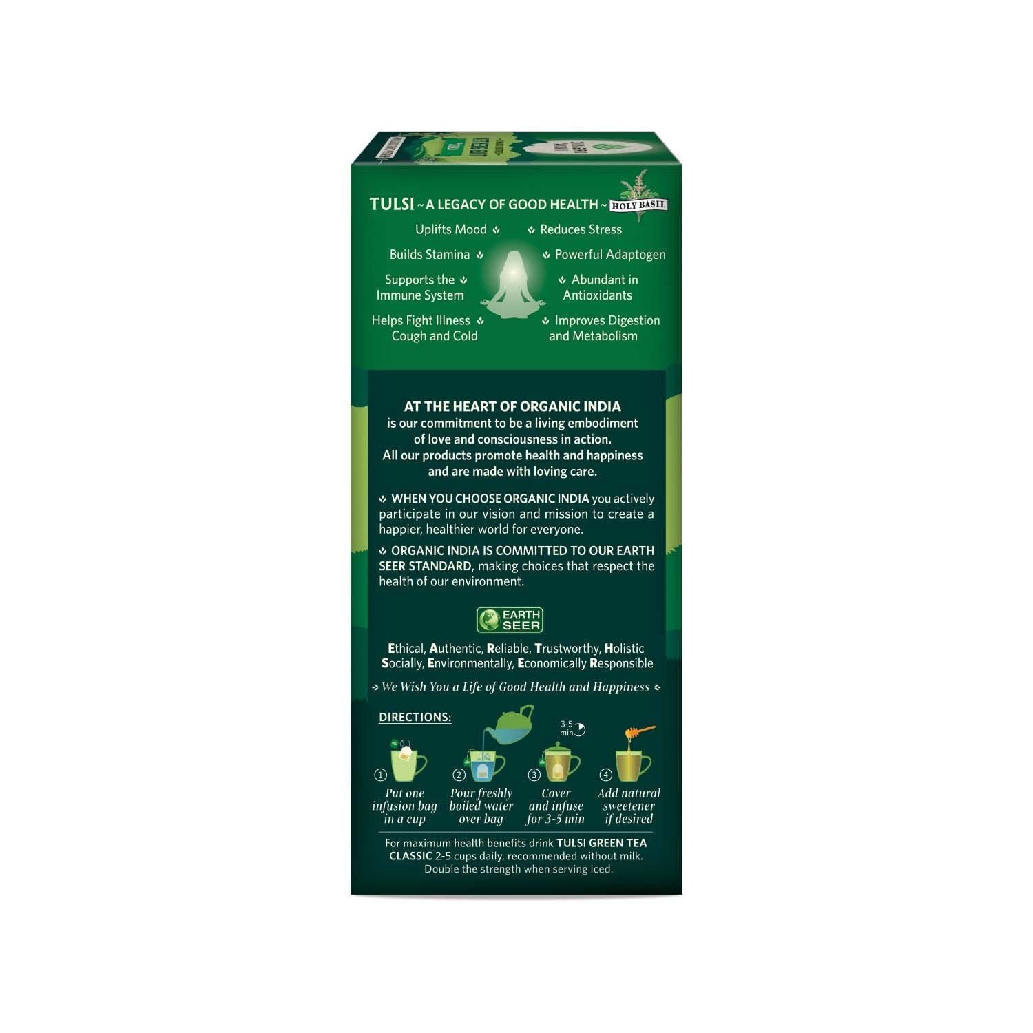 Tulsi Green Tea Classic 25 Tea Bag - Stress Relieving & Refreshing ORGANIC INDIA Tulsi Green Tea contains natural herbs good for healthClinical studies show that both Tulsi & Green Tea promote healthy metabolism which is vital to weight managementBoth offer a vast array of remarkable health benefits including an abundance of antioxidants which eliminate damaging free radicals in the bodyOur amazing combination refreshes and tastes wonderfulDrink up and enjoy.