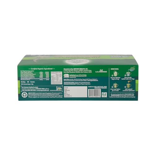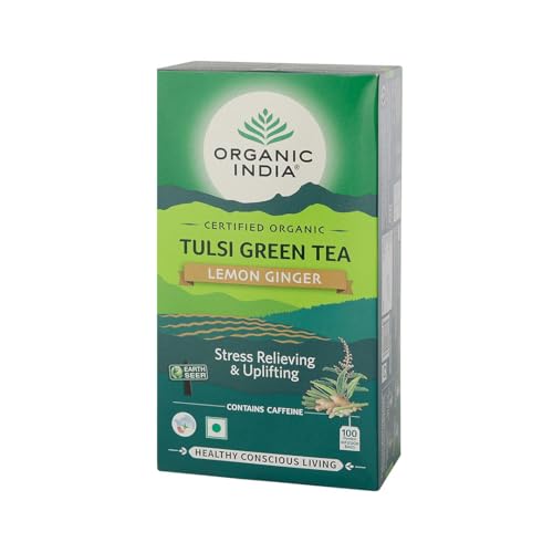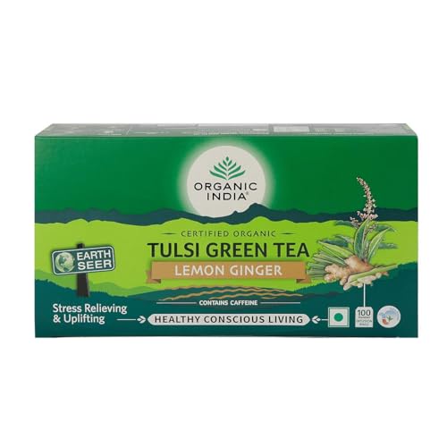 A TATA Product - Organic India Tulsi Green Tea Lemon Ginger - 100 Teabags, Herbal Blend with Green Tea, Tulsi, Lemon & Ginger, Supports Digestion, Refreshing Taste, Natural Ingredients