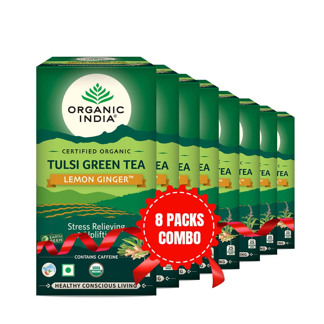 ORGANIC INDIA Tulsi Green Tea Lemon Ginger 25 Tea Bags - (Pack of 8)
