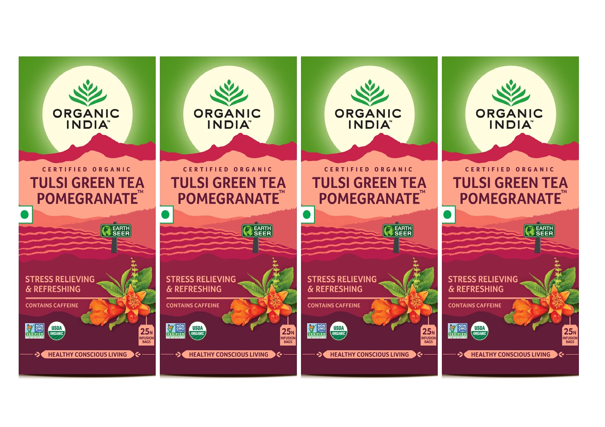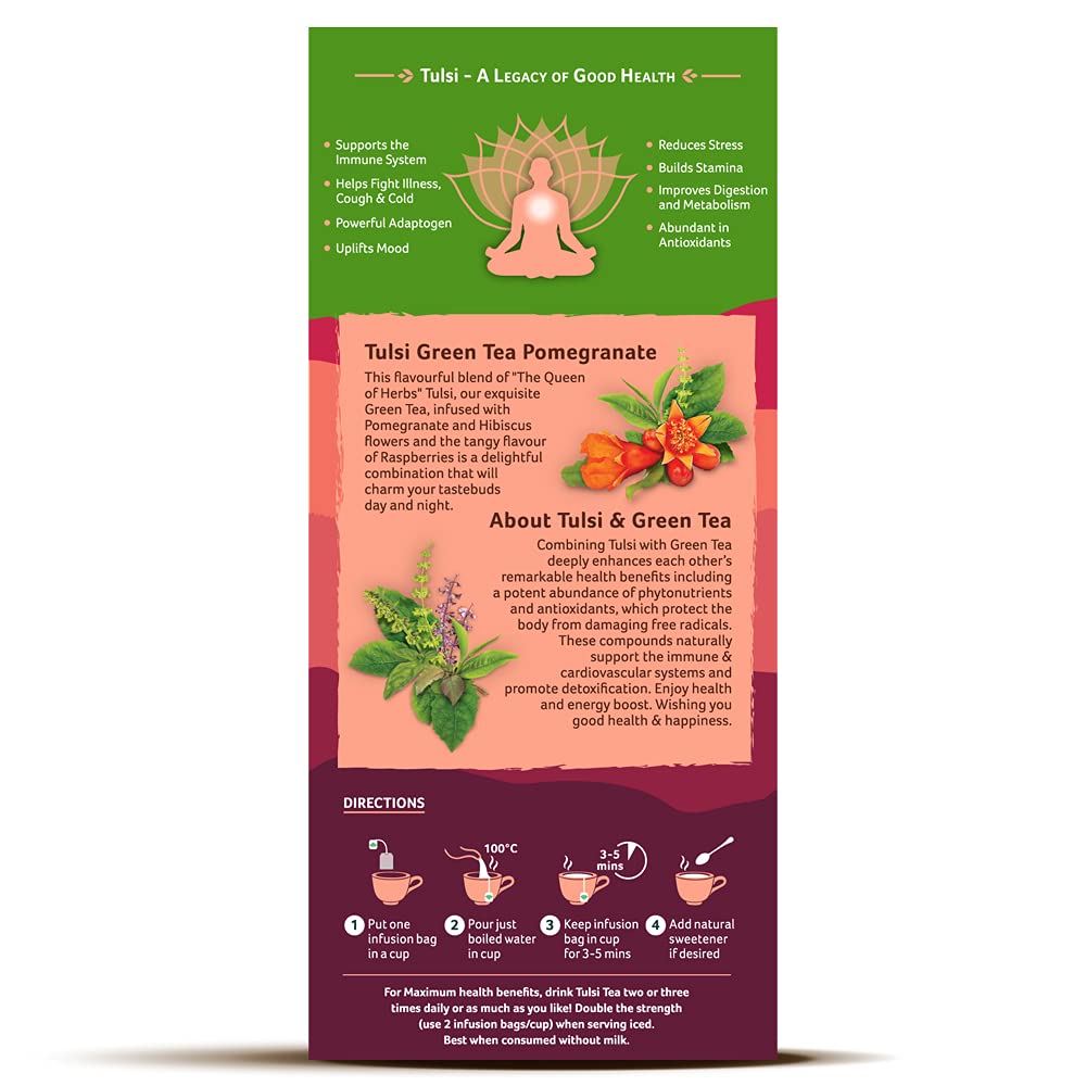 From the range of organic products ORGANIC INDIA offers Tulsi Green Tea PomegranateIt is the symbol of good health since ancient time pomegrante flowers combined with goodness of three types of Tulsi leaves health promoting Green Tea and Hisbiscus flowers with pleasant Raspberry flavorAn all time refereshing tea can make everytime a tea time.