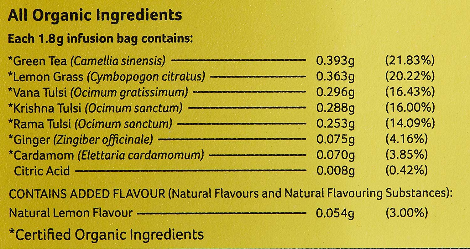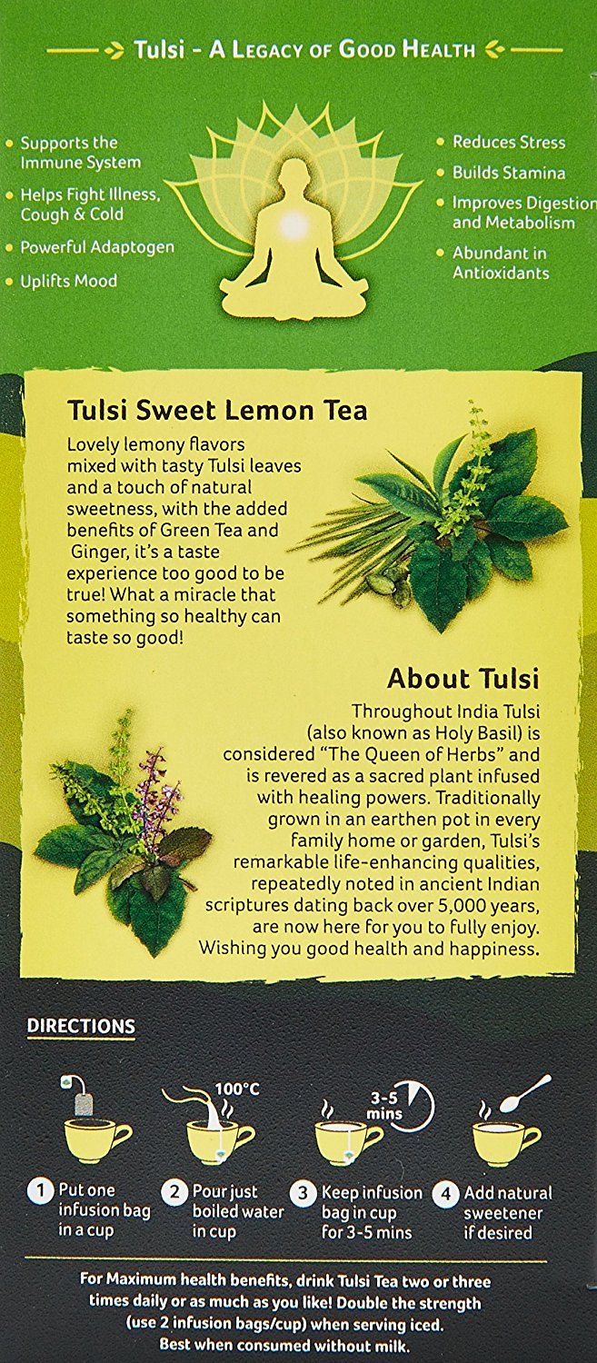 Elevate your tea experience with the invigorating zest of Organic Tulsi Sweet Lemon Tea a premium blend that combines the holistic benefits of Tulsi leaves with the refreshing essence of Green Tea and LemongrassThis organic concoction is perfectly balanced with the warmth of spicy ginger the sweetness of mulethi and the aromatic allure of cardamom creating a delightful sensory journey with every sipCrafted for those who cherish the serenity of a herbal embrace this tea is not just a beverage; it's a rejuvenating retreat in a cupThe unique combination of ingredients ensures a healing and delicious experience making it the perfect choice for moments of blissful relaxation or as a revitalizing start to your dayDirections for use: Add 1 infusion bag per cup (120ml) and pour boiling water over itLet steep for 3-5 minutesDouble the strength if serving icedBest when consumed without milk.