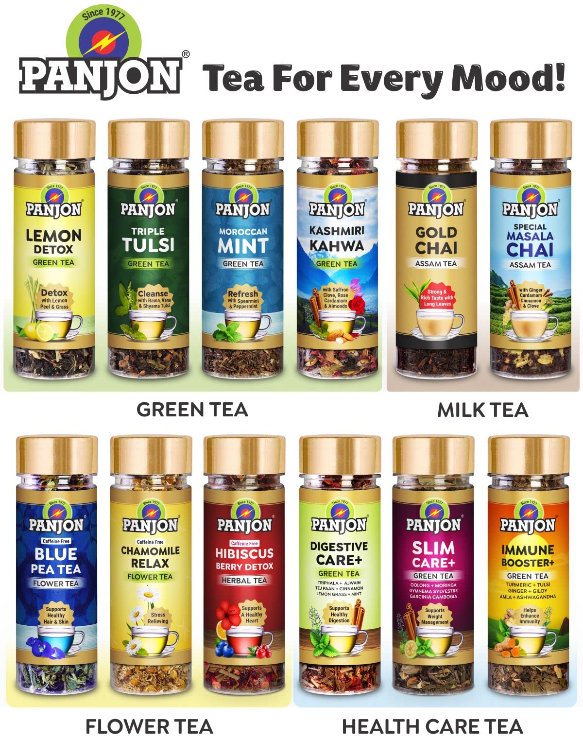 TEA FOR EVERY MOOD SINCE 1977: Try All Panjon Teas - Green Tea: Moroccon Mint Triple Tulsi Lemon Detox Kashmiri Kahwa Digestive Care Slim Care Immune Booster Chamomile Relax Butterfly Pea Blue Tea Hibiscus Berry Detox & Masala Chai Gold Assam Chai Black T