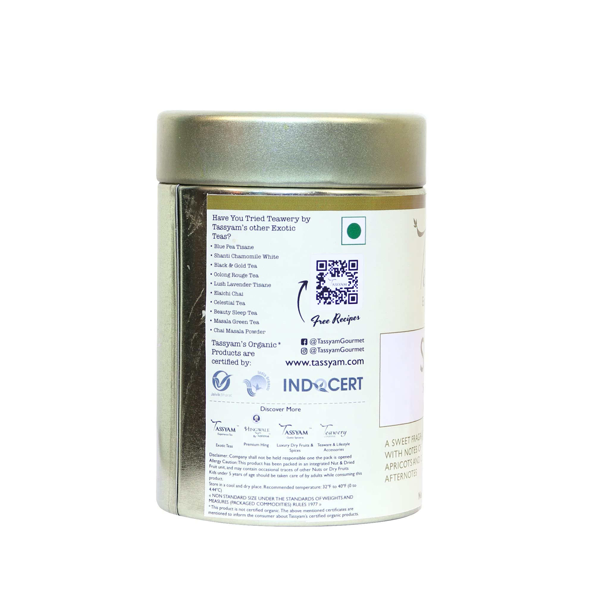 Aptly named as Shanti owing to its calm characteristics Tassyam's white tea is a rare find. The silver down-covered leaves are a unique mix of both glistening white and rusty colours. Brewed this tea acquires a light and almost rose-gold like appearance. With notes of dried apricots and a very smooth aftertaste the tea has a somewhat citrusy-sweet fragrance. To extract the best flavour from this tea add add 2g of the tea to 100-150ml of water (pre-heated to about 85º C) and brew for about 4 minutes. This loose leaf tea can be re-brewed at least twice making a total of about 25 cups. Teas are a seasonal produce and thus flavours keep changing and that's good! Each batch of tea that leaves our facilities is distinct; and this allows you to appreciate the nuances and the subtle differences between each one of them. What we assure is quality; quality in our teas quality in our design and creative philosophy and quality in customer joyfulness (by going a step ahead of customer satisfaction). We steer away for machined produces and make sure that we pour in our hearts while getting your teas hand-picked and hand-blended. The utmost care dedicated to the production and packaging results in impeccable perfection and exclusivity. As we continue our journey to discover this perfection we invite you to share this alluring experience with us.