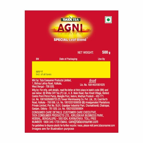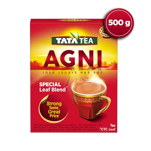 Energetic sip every morning! Tata Tea Agni Special Leaf Blend is a special blend of CTC leaves that offers an invigorating experience every morning. Energize yourself and face your day with Tata Tea Agni. If you are longing for a strong cup then Tata Tea Agni is what you need with its promise of Strong Taste Great Price'. Enjoy perfect richness in every sip of tea. Have this strong cup of tea to awaken your senses in the morning between work or with your evening snack. Usage: Add Tata Tea Agni in boiling water. Add sugar and milk. Continue to boil for a few minutes. Strain into a cup & enjoy your strong cup of tea. Storage: Once opened transfer the contents into an airtight container and keep the lid tightly closed after each use.