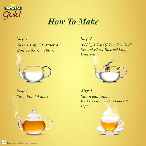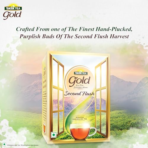 Second Flush refers to the tea leaves picked during the second harvesting season of the year. These larger fast-growing leaves yield a stronger yet smoother flavour characterised by distinct muscatel and fruity notes. Our master blenders beautifully craft Tata Tea Gold Second Flush Roasted Darjeeling Tea with utmost care and passion. Discover the pure fresh essence from one of the Darjeeling's finest in every cup of Tata Tea Gold Second Flush. Finely hand-plucked gorgeous purplish buds of the second flush harvest created with a passion for you to enjoy every cup's deliciously rich taste along with a smoky aroma. Its quiet unadulterated elegance lingers on the palate. Tease your senses with one of Darjeeling's finest! How To Make 1. Take 1 cup of water 2. Boil to 95°C - 100°C 3. Add 2g/1 tsp of the Roasted Long Leaf Tea 4. Steep for 3-4mins Best enjoyed without milk & sugar