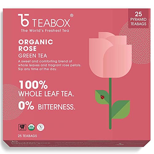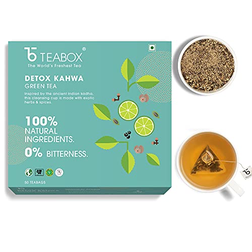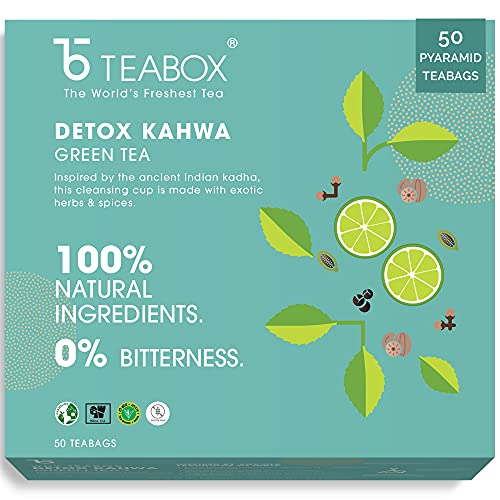 Teabox Detox Kahwa Green Tea 50 Teabags | Made with 8 Natural Ingredients | Helps Cleanse | Immunity Booster | Cold ReliefInspired by the ancient Indian kadha we have sourced these rare and exotic herbs and spices from the dense tropical forests to make a cleansing cup for your everyday well-being. A natural health-boosting cup perfect to sip any time of the day!Teabox Rose Green Tea Bags 25 Pieces | For Glowing Skin | Made with 100% Whole Leaf & Natural Rose PetalsTea plays an important part in our lives as a daily beverage of choice. With growing awareness the appreciation for green tea has increased as a convenient health supplement. Our green teas are made with all-natural ingredients and are all whole leaves that come in pyramid tea bags maximizes the space inside the cup. The pyramid shape allows the ingredients to unfurl and expand. This in turn allows all the flavours to be completely released into your cup. This increases efficiency by enabling the whole leaf to be utilized instead of only the tea particles and the fanning. This rose green tea has a very fragrant character and calms you down instantly. Full of vitamin a and e it helps hydrate and tighten the skin and reduce dark circles. It is also very good for your heart health. Drink it after your long workday to relax you and every day before bed. Now enjoy green teas like never before With high-grade whole leaves that have 5 times more antioxidants than black teas.