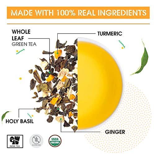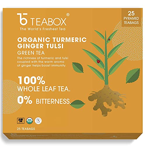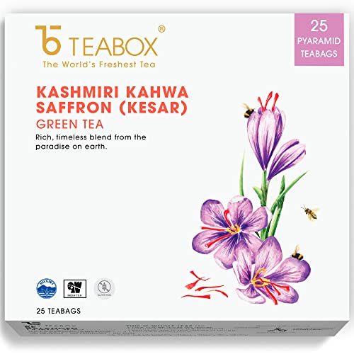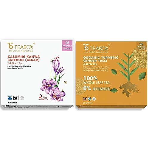 Teabox Fresh Kashmiri Kahwa Saffron (Kesar) Green Tea | Green Tea Handblended with Natural Saffron Almond Cardamom & Cloves | 100% Natural Ingredients 25 TeabagsFlavour: Kashmiri kahwa green tea (teabags) size: 1 box (pack of 16) about the product: experience the world's first natural nitrogen-flushed teabags that seals in the freshness of teas within better than any other. Now you can enjoy the most delicious cup of tea with absolute ease. Our take on a classic brew from the Kashmir valley. Liquor aroma: lifted aroma of saffron and sweet spices liquor taste: the flavors start off savory and woody characteristic of the high-fired green tea. The lento clove note reveals itself next and lingers awhile on the palate. Liquor complements: a refreshing alternative to mimosas at a sunday brunch Teabox: India's modern tea company based out of Darjeeling the heartland of India's tea growing region Teabox is revolutionizing the way India's 200-year old tea industry works. By focusing on preserving the quality and integrity of fine orthodox teas from top tea gardens of India and Nepal Teabox is making sure tea lovers everywhere enjoy the best teas from every harvest at their freshest best. What makes Teabox teas the best. Teabox works directly with over 150 top tea gardens across India and Nepal and procures the freshest teas every harvest season within a week of their production. And with their state-of-the-art dehumidifying and cold storage solutions Teabox is able to keep the freshness aroma and taste of these fine teas intact in the best possible way. Step 1scoop a desired amount of loose tea into a tea maker. Step 2pour over recently heated water and allow the leaves to steep for 2-5 minutes. Step 3once the tea tastes to your liking discard infused leaves and pour a cup. Featured stories about the start-up describe your product in 3 words. Fresh. All-natural. Delicious how did you come up with the idea for this product. My family has been in the tea business for many years and having grown up around Darjeeling I have always had a strong affinity to tea. It was only when I travelled abroad that I realized there is immense global potential to connect tea lovers of the world to better quality produce than the ones they are used to. We started working with a few gardens at first and slowly more and more tea gardens actively became a part of our fresh tea revolution one that now connects top quality teas directly to the consumers. What makes your product special. Ours is the freshest tea there is. And because it's fresh it's the most delicious too. Freshness matters because tea is an agricultural product. So just how you eat a season's freshest produce you should be able to drink the freshest and the most distinctive teas from every harvest season. What has been the best part of your start-up experience. The response from the global tea community has been truly humbling. They are embracing the fresh tea revolution trading consistency' and mass' for high-quality teas that are one-of-a-kind and truly honor the singular virtues of tea gardens of India and Nepal.Teabox Organic Turmeric Ginger Tulsi Green Tea Bags 25 Pieces | For Immunity Boosting & Sore Throat Prevention | Made with 100% Whole Leaf Natural Ginger Turmeric & TulsiCOUNT- Includes 25 Teabags and 2 Free Samples. BLEND FOR HEALTH- Pure high-grade long leaf green tea leaves blended with natural ingredients-turmeric ginger tulsi to enhance immunity. STEEPING GUIDE- Heat 180 ml of water at 80â -85â Place the teabag in a cup and then pour hot water over it. Steep for 3-4 mins. Drink plain or add honey as per taste. Savor a cup of freshness and relax. INGREDIENTS - Green Tea Turmeric Tulsi Ginger. BENEFITS- Contains pure high-grade tea leaves with more anti-oxidants & bioactive. The unique pyramid design of teabags allows better unfurling of leaves for a better taste and experience. Can be steeped twice. ABOUT TEABOX- Disrupting a 200-year-old industry Teabox connects tea to people directly from the foothills of the Himalayas. We source fresh Indian tea and have served over 5 Billion cups to 121 countries. FROM THE SOURCE- Teabox sources 100% fresh tea directly from over 273 Indian tea gardens in less than 1 week.