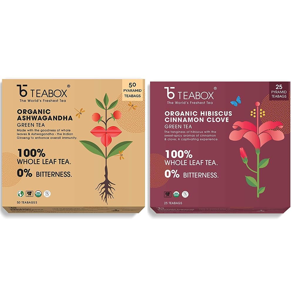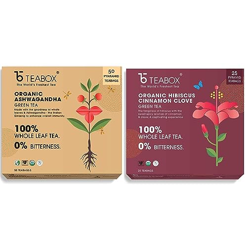 Teabox Organic Ashwagandha Green Tea 50 Teabags | Ayurvedic Blend of Premium Green Tea and Natural Ashwagandha | Boosts Immunity and Improves Memory | Silken Pyramid TeabagsAlso known as the king of herbs ashwagandha is a revered herb native to India. The all natural 100% ashwagandha blended with whole leaf green tea contains neither any dust nor fannings. Enclosed in thermostable food contact safe and recyclable pyramid teabags it allows the tea leaves and ingredients to open up and infuse better. Naturally known to aid immunity boosting ashwagandha is also identified as an adaptogen. Blended with green tea it helps the body in managing stress too. Flavours are woody and aromatic with notes of cardamom.Teabox Organic Hibiscus Cinnamon Clove Green Tea Bags 25 pcs | 100% Natural Hibiscus Cinnamon & CloveCOUNT- Includes 25 Teabags and 2 Free Samples. HEALTH BENEFITS - Pure high-grade long leaf green tea leaves blended with natural Hibiscus cinnamon and clove for a refreshing experience. MAKES FOR A VERY GOOD ICED TEA. STEEPING GUIDE- Heat 180 ml of water at 80â -85â Place the teabag in a cup and then pour hot water over it. Steep for 3-4 mins. Drink plain or add honey as per taste. Savor a cup of freshness and relax. INGREDIENTS - Green Tea Hibiscus Cinnamon Clove. THE TEABOX DIFFERENCE - Contains pure high-grade tea leaves with more anti-oxidants & bioactive. The unique pyramid design of teabags allows better unfurling of leaves for a better taste and experience. Can be steeped twice. ABOUT TEABOX- Disrupting a 200-year-old industry Teabox connects tea to people directly from the foothills of the Himalayas. We source fresh Indian tea and have served over 5 Billion cups to 121 countries. FROM THE SOURCE- Teabox sources 100% fresh tea directly from over 273 Indian tea gardens in less than 1 week.