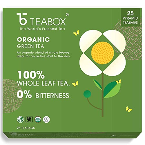 Teabox Organic Darjeeling Green Tea 25 Teabags |100% Whole Leaf Tea Sourced from Darjeeling | Rich in Antioxidants | Healthy and Refreshing | Silken Pyramid TeabagsTea plays an important part in our lives as a daily beverage of choice. With growing awareness the appreciation for green tea has increased as a convenient health supplement. Our green teas are made with all-natural ingredients and are all whole leaves that come in pyramid tea bags maximize the space inside the cup. The pyramid shape allows the ingredients to unfurl and expand. This in turn allows all the flavors to be completely released into your cup. This increases efficiency by enabling the whole leaf to be utilized instead of only the tea particles and the fanning. This Organic Green tea is a refreshing mix of green teas from the hills that is light lively and rich in antioxidants. Apart from aiding weight management this tea also helps you get rid of toxic substances in the body and thereby strengthening the body's immune system. Now enjoy green teas like never before with high-grade whole leaves that have 5 times more antioxidants than black teas.Teabox Organic Hibiscus Cinnamon Clove Green Tea Bags 25 pcs | 100% Natural Hibiscus Cinnamon & CloveCOUNT- Includes 25 Teabags and 2 Free Samples. HEALTH BENEFITS - Pure high-grade long leaf green tea leaves blended with natural Hibiscus cinnamon and clove for a refreshing experience. MAKES FOR A VERY GOOD ICED TEA. STEEPING GUIDE- Heat 180 ml of water at 80â -85â Place the teabag in a cup and then pour hot water over it. Steep for 3-4 mins. Drink plain or add honey as per taste. Savor a cup of freshness and relax. INGREDIENTS - Green Tea Hibiscus Cinnamon Clove. THE TEABOX DIFFERENCE - Contains pure high-grade tea leaves with more anti-oxidants & bioactive. The unique pyramid design of teabags allows better unfurling of leaves for a better taste and experience. Can be steeped twice. ABOUT TEABOX- Disrupting a 200-year-old industry Teabox connects tea to people directly from the foothills of the Himalayas. We source fresh Indian tea and have served over 5 Billion cups to 121 countries. FROM THE SOURCE- Teabox sources 100% fresh tea directly from over 273 Indian tea gardens in less than 1 week.