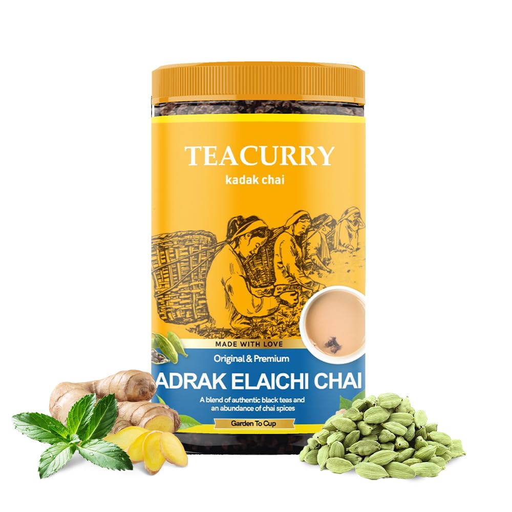 Teacurry's Adrak Elaichi Chai is a premium blend of handpicked tea leaves from India's top tea gardens. Infused with aromatic spices like cardamom cinnamon ginger and cloves this chai offers great wellness benefits. When brewed with water and milk it creates a creamy texture and a wonderful aroma making it the perfect drink for any time of day.