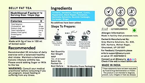 100% Natural Ingredients - Teacurry belly fat tea consists of a powerful Ayurvedic tea blend of Peppermint from Hariyana Coriander from various gardens spread across Assam Black Pepper Cassia cinnamon from Meghalaya mighty ginger from Orissa Dandelion Foe