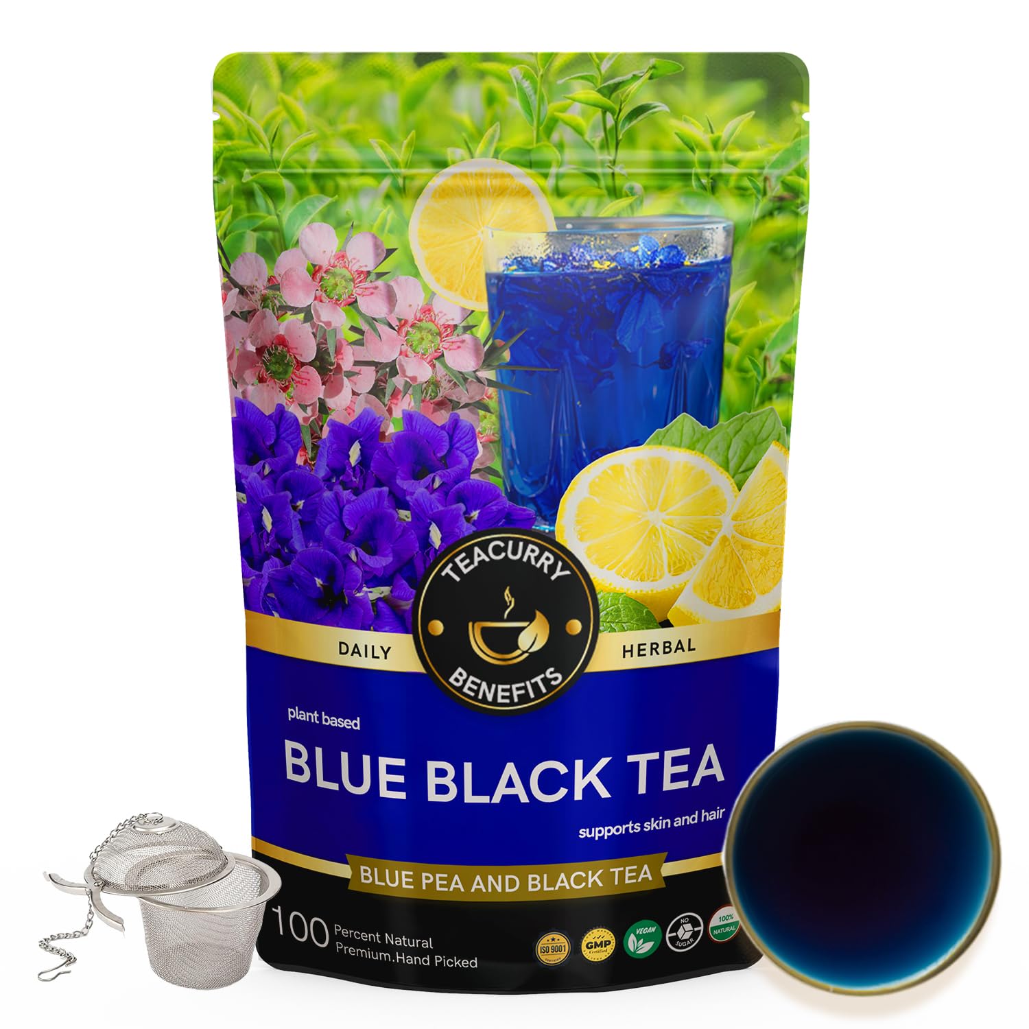 Teacurry Blue Black Tea (200 gram loose+infuser) - Helps with Glowing Skin and Shiny Hair | Flower Based - Caffeine Free | Herbal Tea