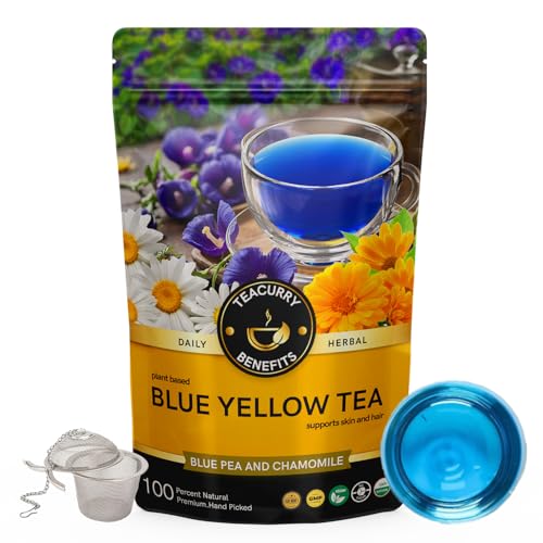 Teacurry Blue Yellow Tea (200 gram loose+infuser) - Supports Skin and Stomach Wellness | Flower Based Caffeine Free Herbal Tea