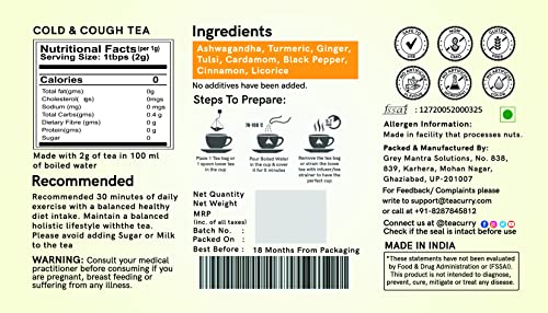 100% Natural Ingredients:-Teacurry Cough and Cold Tea consist of Poshita variety of Ashwagandha from Harayana Turmeric Curcumin Longa (premium variety) sourced from farmers in Andhra Pradesh Cassia cinnamon from Meghalaya Black Licorice (mulethi) from Pun