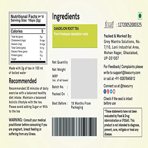 • 100% Natural Ingredients - Teacurry Dandelion root tea contains only natural ingredients like Dandelion root. All these provide the perfect blend for of the and and dandelion herbal tea contains no no artificial flavorsr decreases the craving for alcohol.