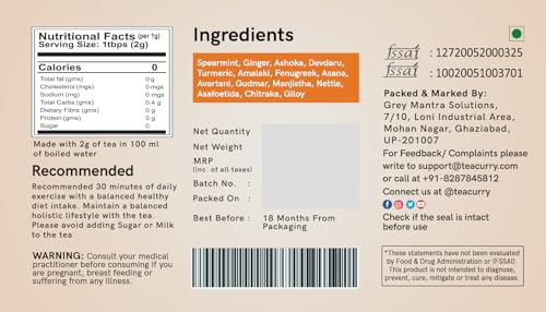 100% Natural Ingredients - Teacurry facial hair Tea consist of Spearmint Ginger Ashoka Devdaru Giloy Turmeric Amalaki Fenugreek Asana Avartani Gudmar Manjistha Asafoetida Chitraka and Nettle.