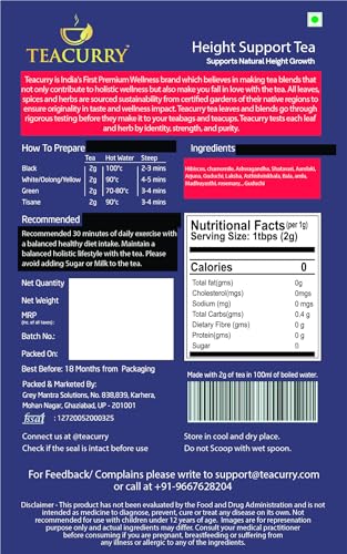Natural Blend - Teacurry Height Support Tea features a mix of natural components including hibiscus chamomile ashwagandha shatavari aamlaki arjuna guduchi lakshya asthishrinkhala bala madhuyasthi rosemary and amla.