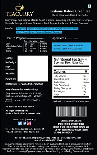 TEACURRY Kashmiri Kahwa Green Tea - 50 Grams Loose / 25 Cups + Infuser | Helps with Immunity Weight Management and Digestion | Kahwa Sugar-Free | Kahwa Tea Loose | Kahwa Chai