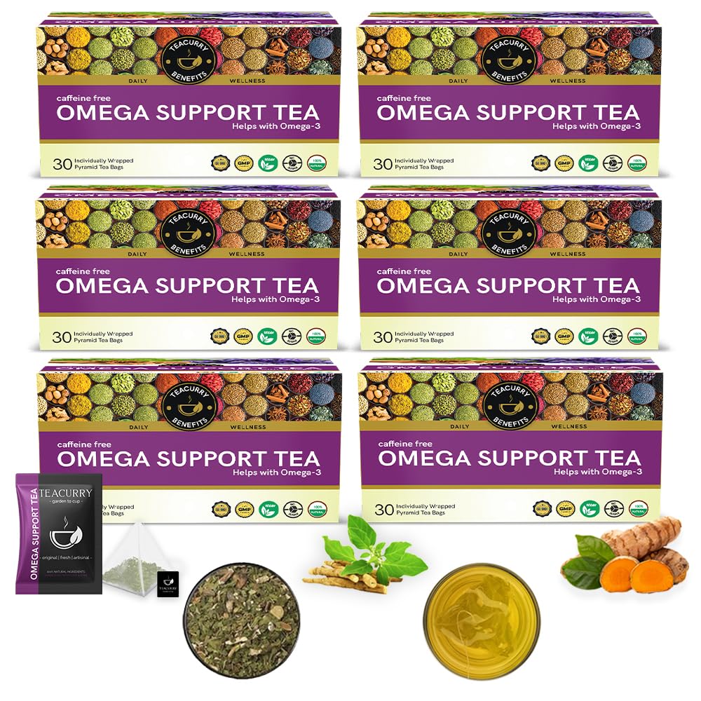 Teacurry Omega Support Tea is a powerful blend of natural herbs and plant-based ingredients. Rich in omega 3 it is designed to support overall wellness including wellness for the eyes brain hair and joints. It is crafted from a unique blend of natural ingredients including Peppermint Fennel Ginger Chia Seeds Flax Seeds Coriander Turmeric Cumin Seeds Oregano Ashwagandha Gotu Kola Lemon Balm Cardamom.