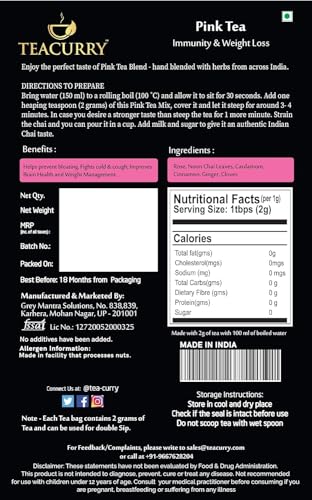 HomeGroceryBeveragesTeaTEACURRY Pink Tea Mix-15 Sachets|Pink Ginger Tea Mix Helpful For Immunity Pink Tea For Weight Loss And Bone Health|100% Natural Pink Tea Kashmiri Leaves|Pack Of 130 Grams