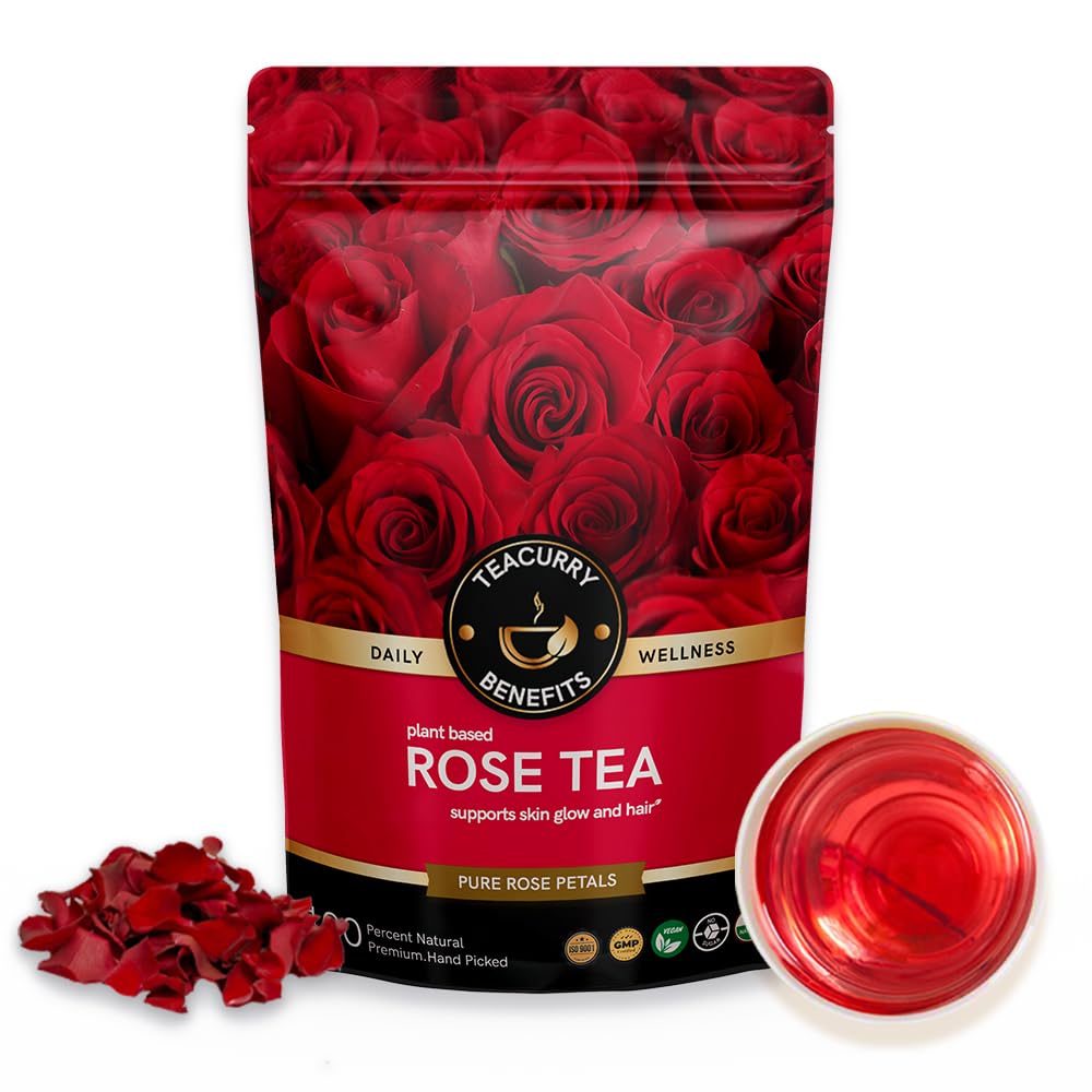 Teacurry Rose Petals Tea: A delightful flower tea crafted from pure Damask rose petals sourced from Maharashtra. Handpicked and carefully inspected our tea is free from gluten and caffeine suitable for all ages. Packed with 5000-year-old Ayurvedic wisdom it offers specific benefits: supports wellness Available as tea bags.