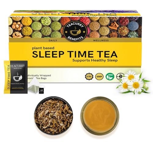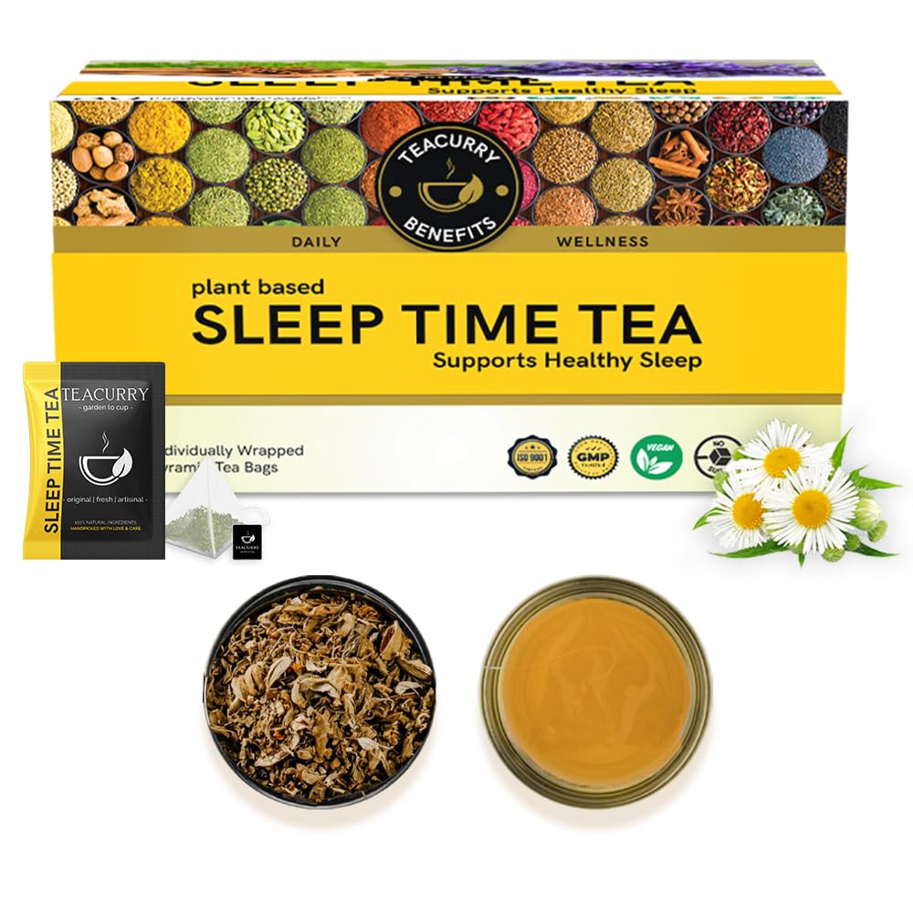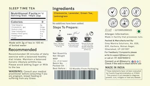 Teacurry Sleep Tea or Sleeptime Tea is a soothing blend of green tea chamomile lavender and lemongrass. This all-natural tea helps calm your nerves and relax your mind. Research shows that chamomile and lavender work together to help you unwind quickly and enjoy a restful night.