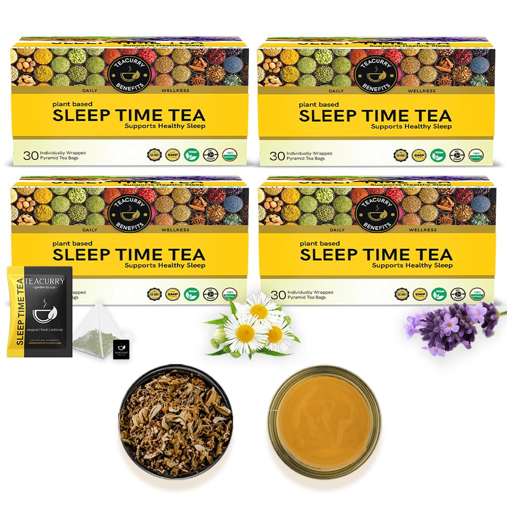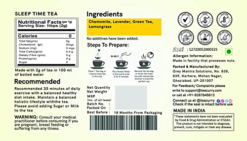 Teacurry Sleep Tea or Sleeptime Tea is a fortified blend of green tea with Chamomile Lavender and Lemongrass. It is a 100% natural tea for calming the nerves and relaxing your mind. The research is that Teacurry Night Tea helps relax instantly because of antioxidants in Chamomile and Lavender. The tea provides 4 very specific benefits - helps with better sleep. Having a sweet floral taste Teacurry's Ayurvedic tea for sleep also helps in over all health Teacurry Sleep Enhancing Tea consists of a powerful blend of dried chamomile flowers sourced from Himachal Pradesh in form of Matricaria Chamomile Lavender sourced from the Kashmir Valley in form of Lavandula Stoechas Green tea from Assam and Lemongrass from Kerala in form of Cymbopogon Citratus. Sweet and earthy in taste chamomile tea manages to lull you to sleep. Both the taste and fragrance from the lavender flowers help promote calmness and wellness.