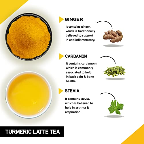 Teacurry Spiced Turmeric Latte is a perfect balance of taste health and aroma - consisting of Turmeric in form of Curcumin Longa sourced from Andhra Pradesh Indian Ginger from Orissa Cinnamon in form of Cassia cinnamon from Meghalaya Indian Black Pepper in form of the Panniyur-3 sourced from Kerala and Cardamom sourced from the Idukki district in Kerala. Teacurry Spiced Turmeric Latte in form of Turmeric Tea Bags and Turmeric Latte mix has a pungent sweet taste with a distinct turmeric flavour. This turmeric tea with cinnamon ginger black pepper and cardamom in the form of golden milk powder - is the perfect Turmeric Tea for weight loss and further lacks tartness facilitating a sweet sensation to the tongue. Our Golden Milk Haldi is a perfect blend of desi detox tea to cleanse the digestive system boost immunity and relieve oxidative stress. Moreover this spiced Turmeric Latte powder has a strong spicy-sweet fragrance. Bright yellow-orange spice Turmeric has been used for its medicinal antioxidant and anti-inflammatory properties for thousands of years. Turmeric helps boost immunity reduce the risk of asthma lower cholesterol and fight uveitis. Obtained from the inner barks of Cinnamomum tree Cinnamon is used as an aromatic condiment and a powerful medicinal spice. It is loaded with antioxidants and anti-inflammatory properties and it further reduces the risk of heart diseases lowers blood sugar levels and fights bacterial and fungal infections. Ginger further reduces the risk of nausea and eases pain in case of Menstrual cramps and in osteoarthritis. Indian Cardamom has been used for ages to fight against digestive problems help with bad breath prevent cavities improve breathing and protect the liver. Teacurry black pepper has high antioxidant content and is full of anti-inflammatory properties. It benefits your brain improves blood sugar levels lowers cholesterol and promotes gut health.