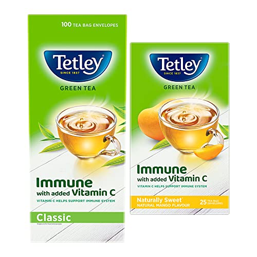 Tetley Green Tea - Pure & Original 100 tea bags (1.3g each)Regardless of how your day is going you will need a dose of freshness to relax and rejuvenate. Naturally rich in antioxidants Tetley Green Tea gives you just that. The antioxidants help to reduce the harmful effects that stress and pollution may have on your body. Try a cup everyday to know how it refreshes you like a 5 minute vacation on a busy day! Free your mind thats Tetley.Tetley Green Tea Reviving Mango 25 Tea BagTetley green tea reviving mango gives you the goodness of green tea in a sweet taste. Rich in anti-oxidants green tea sweetened with exotic flavours such as delicious mango and naturally sweet monk fruit flavours is a unique blend put together by our experts to make every sip delightful.