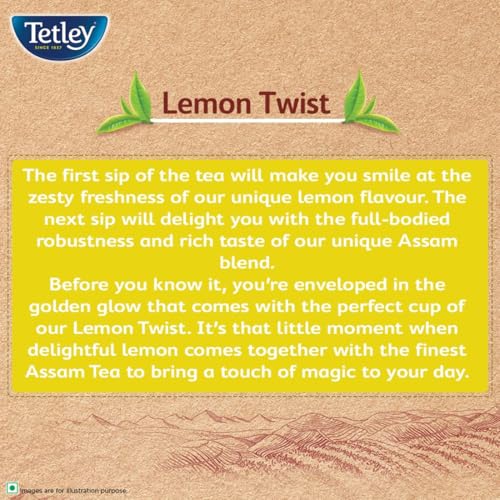 Now refresh rejuvenate and relax with Tetley. Introducing Tetley Lemon Twist Tea which indulges you in the refreshing flavour of lemon. The first sip will make you smile at the zesty freshness of our unique lemon flavour. The next sip will delight you with the full-bodied robustness and rich taste of our unique Assam blend. Before you know it you're enveloped in the golden glow that comes with the perfect cup of our Lemon Twist. It's that little moment when delightful lemon comes together with the finest Assam Tea to bring a touch of magic to your day. Tetley is available in a variety of black tea flavours including Tetley Original Masala Chai Elaichi Ginger Zing Darjeeling and English Breakfast.