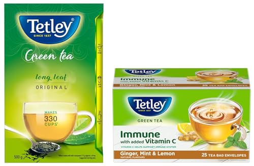Tetley Long Leaf Original | All-natural Green Tea with Anti-Oxidants | Green Tea | 500gStart afresh with Tetley! To stay refreshed all day sip the refreshing Tetley Long Leaf Green Tea. Being an excellent source of antioxidants Tetley Green Tea has various beneficial effects on health such as it helps you feel relaxed by hydrating your body and flushes out all the toxins from your body. The finest and long tea leaves are blended for a smooth and soft taste with an all-natural green tea flavor. You can now enjoy freshness whenever and wherever you want such as after breakfast before exercise or before bedtime. USAGE INSTRUCTIONS: Add just ½ tbsp. of Green Tea Leaves to boiling water. Brew the tea for 2 minutes. Add honey if desired & enjoy the perfect green tea!Tetley | Ginger Mint & Lemon Flavored Green Tea | Immune with Added Vitamin C | 25 Tea BagsTetley Green Tea is undoubtedly an excellent source of anti-oxidants. All the goodness now comes with immunity power of added Vitamin C with new Tetley Green Tea Immune Range. While anti-oxidants help cleanse your body from within Vitamin C helps support your bodyâs immune system. This green tea with no calories provides many more benefits like boosting fat metabolism helping to stay hydrated and helping to feel light and active. Driven by sustainability these green tea bags are 100% plastic-free and staple-free. The flavoured variants contain 100% natural flavors. # A cup of green tea contains as much as 5 times (5X) the anti-oxidants in an apple. (âUSDA Database for the Flavonoid Content of Selected Foodsâ Rel 3.3 March 2018)