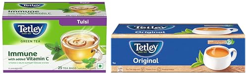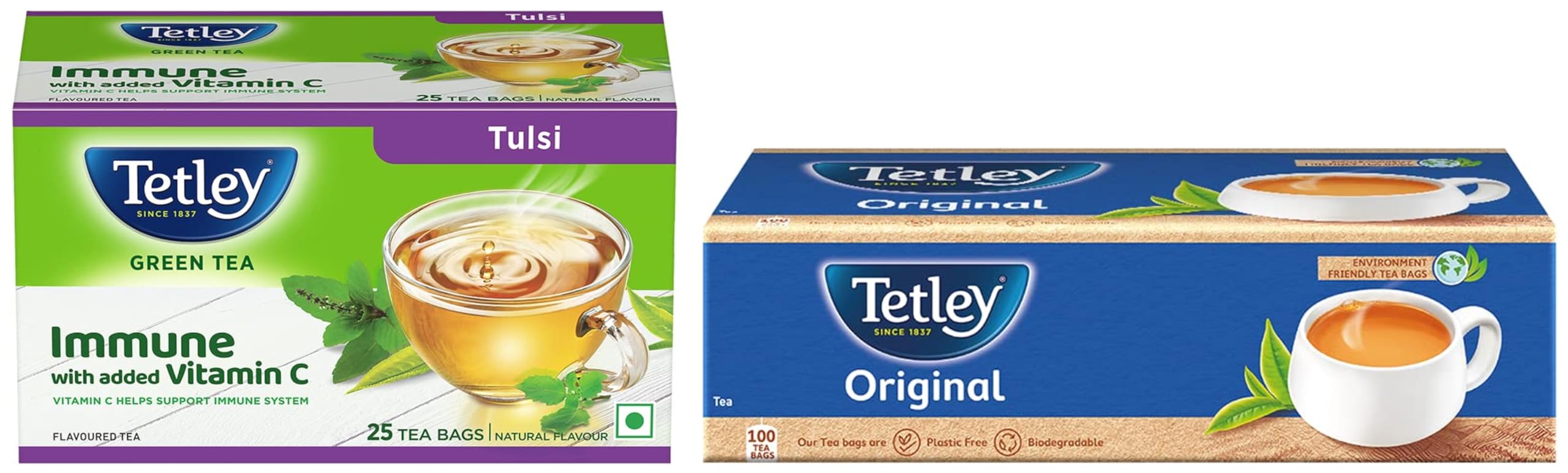 Tetley | Original | Rich Taste of Assam Tea |100 Tea Bags | 1.7g EachPour freshly boiled water into a cup. Place one teabag and let it brew for 1-2 mins. Remove the teabag. Have as black tea or add milk and sweeten with sugar as desired.Tetley Green Tea Immune Tulsi | With Added Vitamin C | Natural Flavour | 25 Tea BagsTetley Green Tea now with an extra punch! Tetley Green Tea is undoubtedly an excellent source of antioxidants. All the goodness now comes with an extra punch of added Vitamin C with the new Tetley Green Tea Immune Range. While antioxidants help cleanse your body from within Vitamin C helps support your bodyâs immune system. Each cup provides 10% of your daily requirement of Vitamin C. Enjoy this great tasting cup of Green Tea with memorable Tulsi flavour that ensures rejuvenation in every sip. #A cup of green tea contains as much as 5 times (5x) the antioxidants as an apple. (âUSDA Database for the Flavonoid Content of Selected Foodsâ Rel 3.3 March 2018).