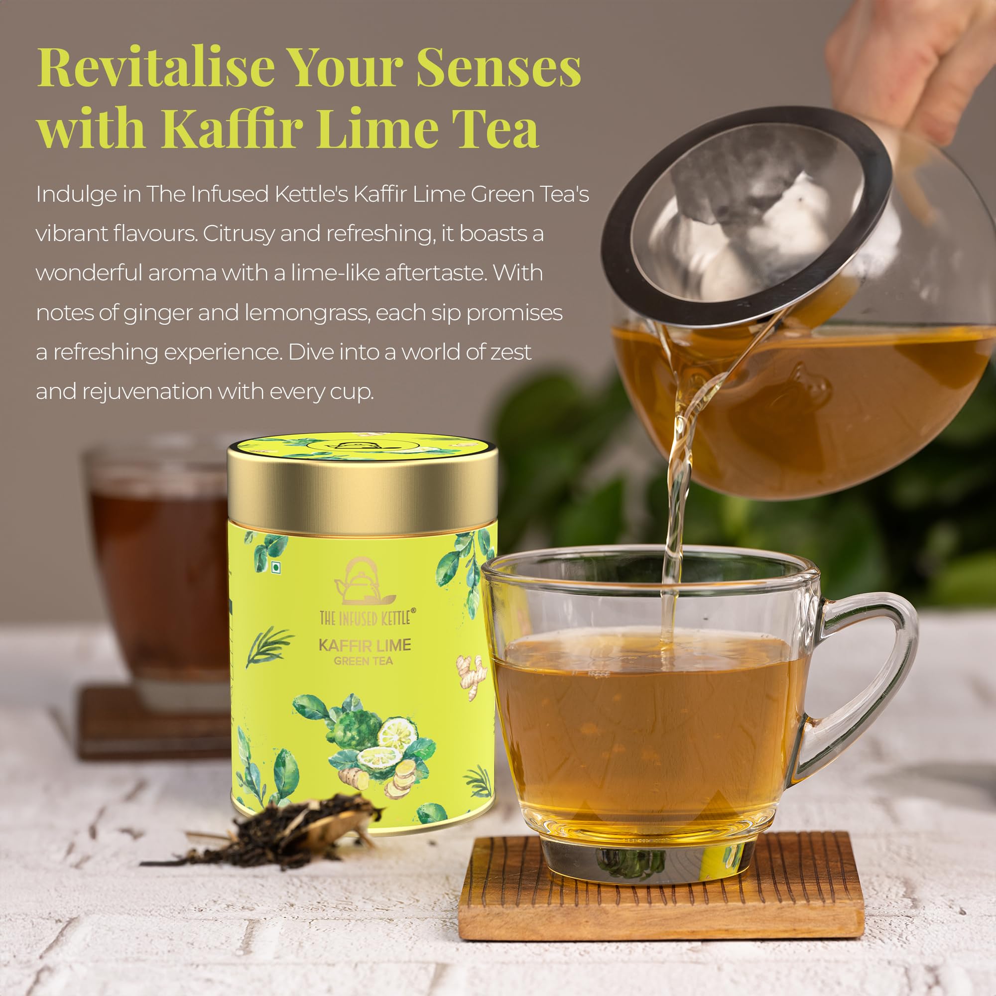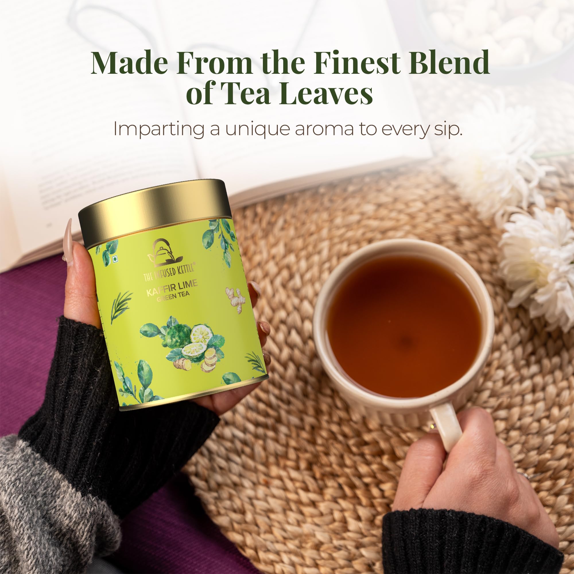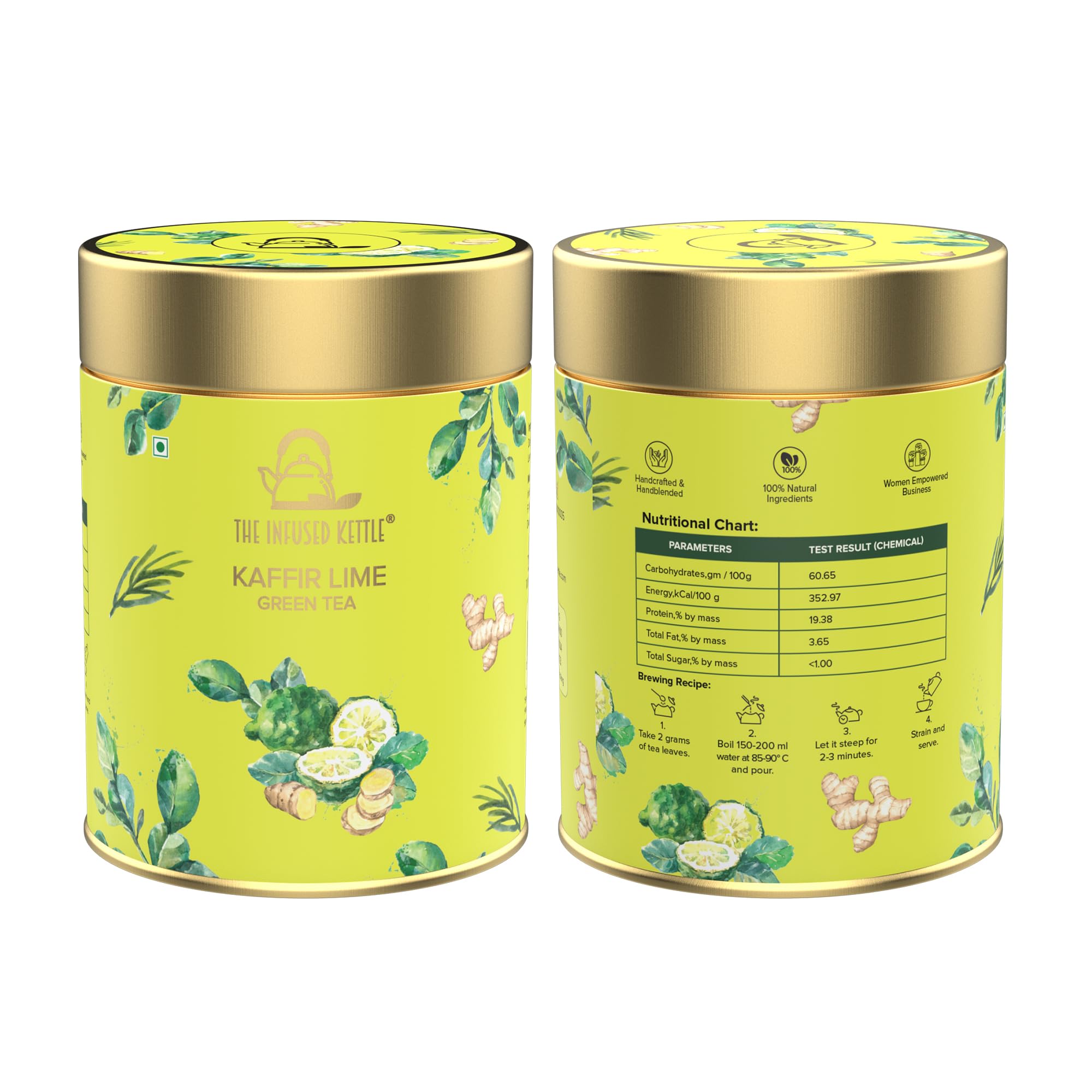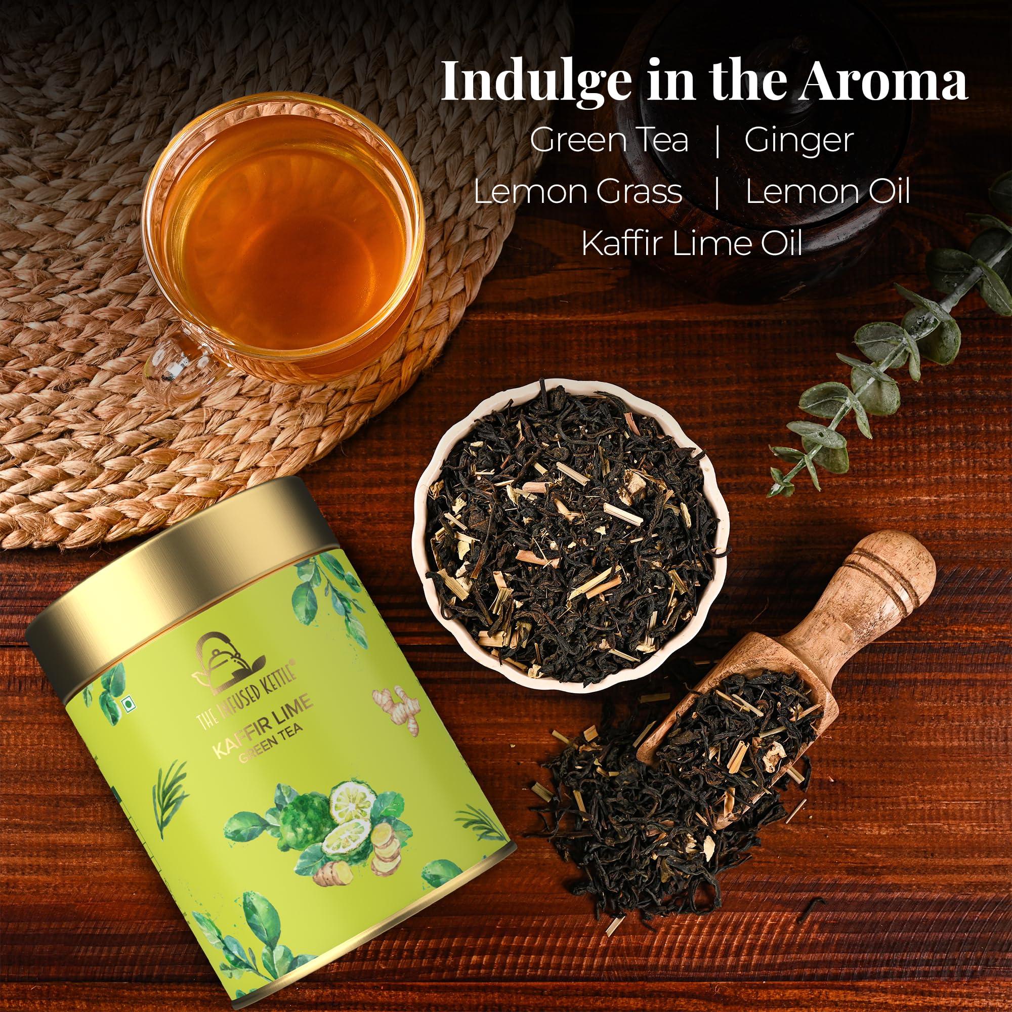 The Infused Kettle Premium Kaffir Lime Green Tea 22 Cups Loose Herbal Darjeeling Whole Leaf Tea Blended with Ginger Lemon Grass Lemon Oil & Kaffir Lime Oil Low Caffeine Chai - 50gm