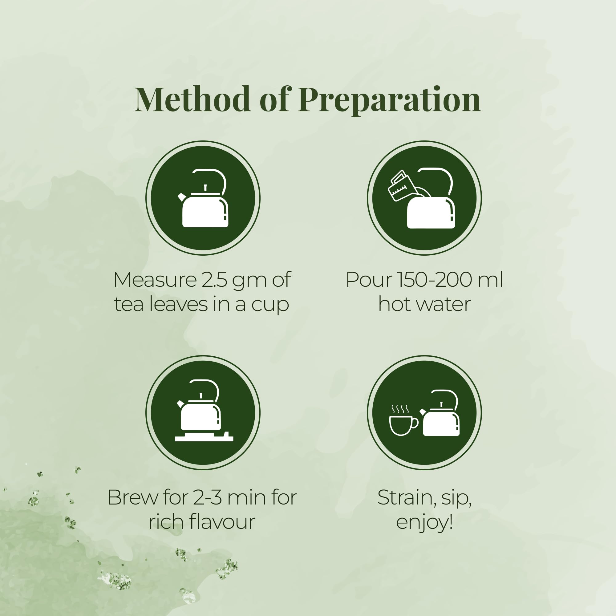 QUICK BREW DELIGHT: Enjoy a hassle-free tea experience with our 22-cup pack. Simply take 2.5 gm of tea leaves in a cup pour 150-200 ml hot water steep for 2-3 minutes strain and savor. Best served hot without milk; add sugar to taste if desired