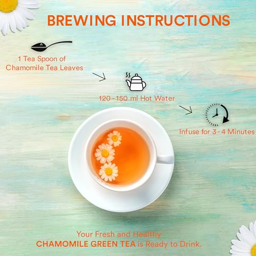 Make your Cup of Organic Chamomile & Green tea - Boil 1 cup of water and close the flame add 2 gms of the whole leaf and close the lid let it brew for 4 - 5 minutes. Strain and fetch your cup and take it to your happy place.