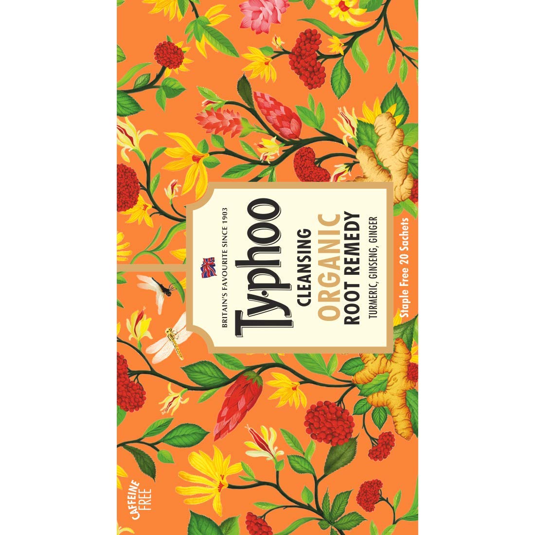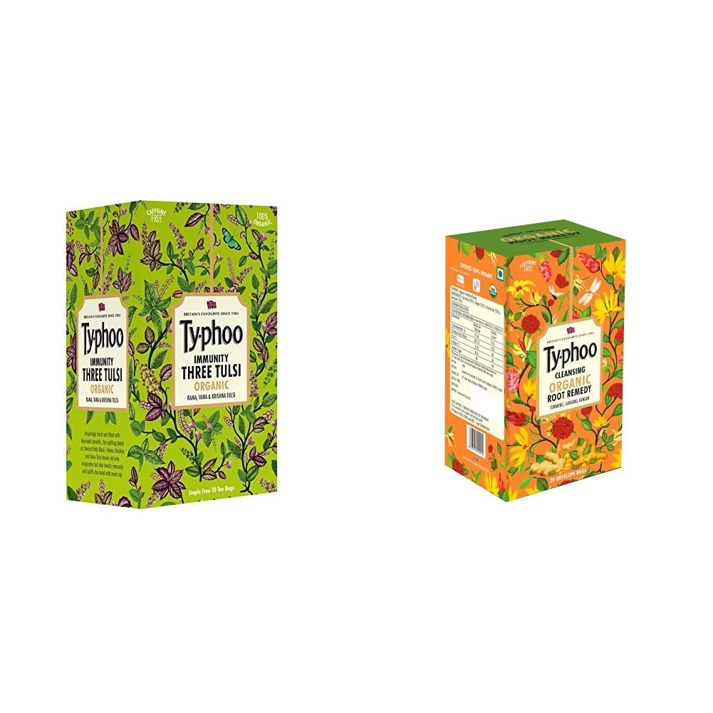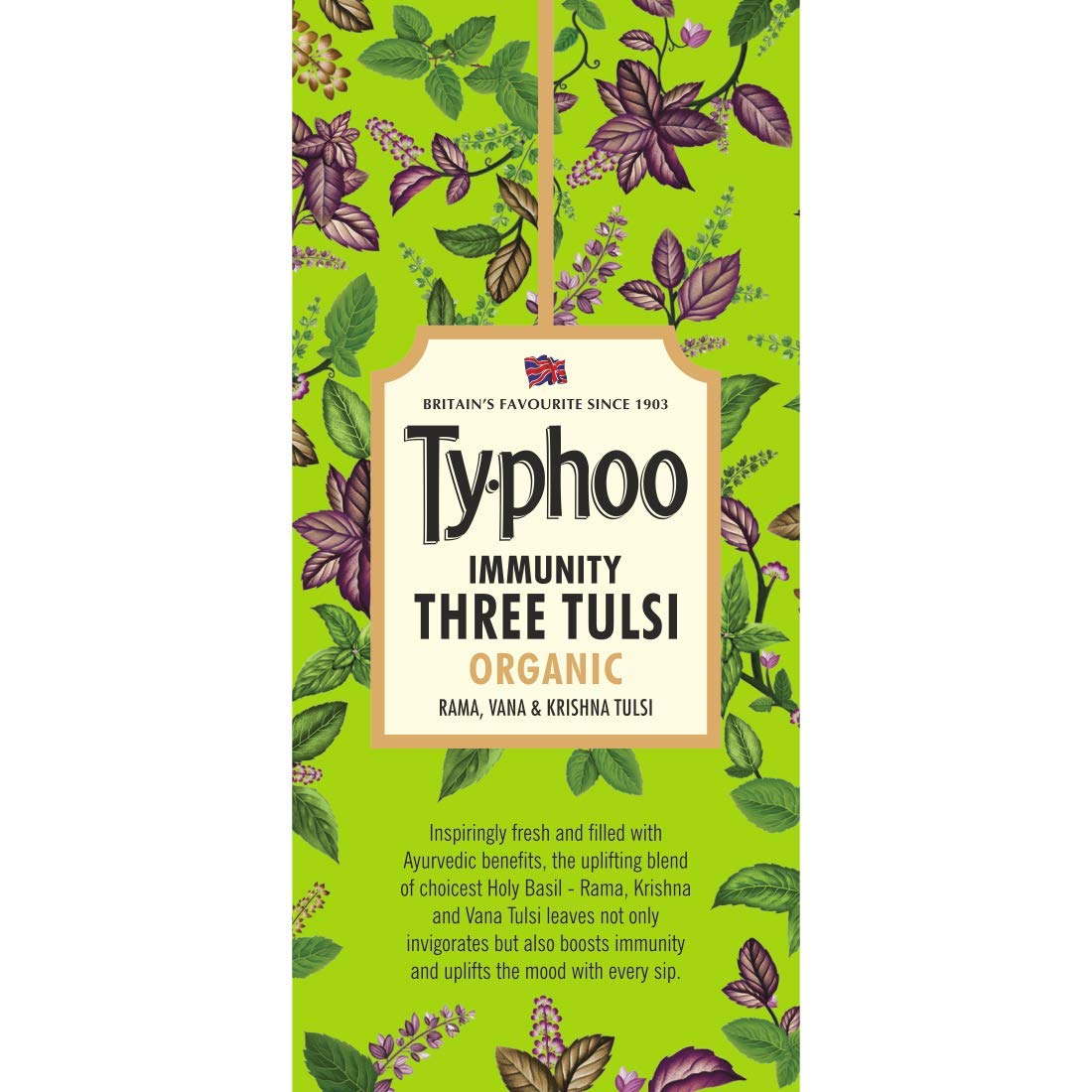 Typhoo Immunity Three Tulsi Organic Pouch 30 gTyphoo immunity three tulsi organic tea is a blend of Rama Krishna and Vana tulsi an ayurvedic herb that has multiple benefits for your health.Typhoo Cleansing Organic Root Remedy Tea Bag (20 Tea Bags)A caffeine free turmeric infused blend with natural detoxifiers and immunity boosters. The aromatic and earthy notes of Indian ginseng root combined with flavourful cinnamon and ginger naturally support your wellbeing.