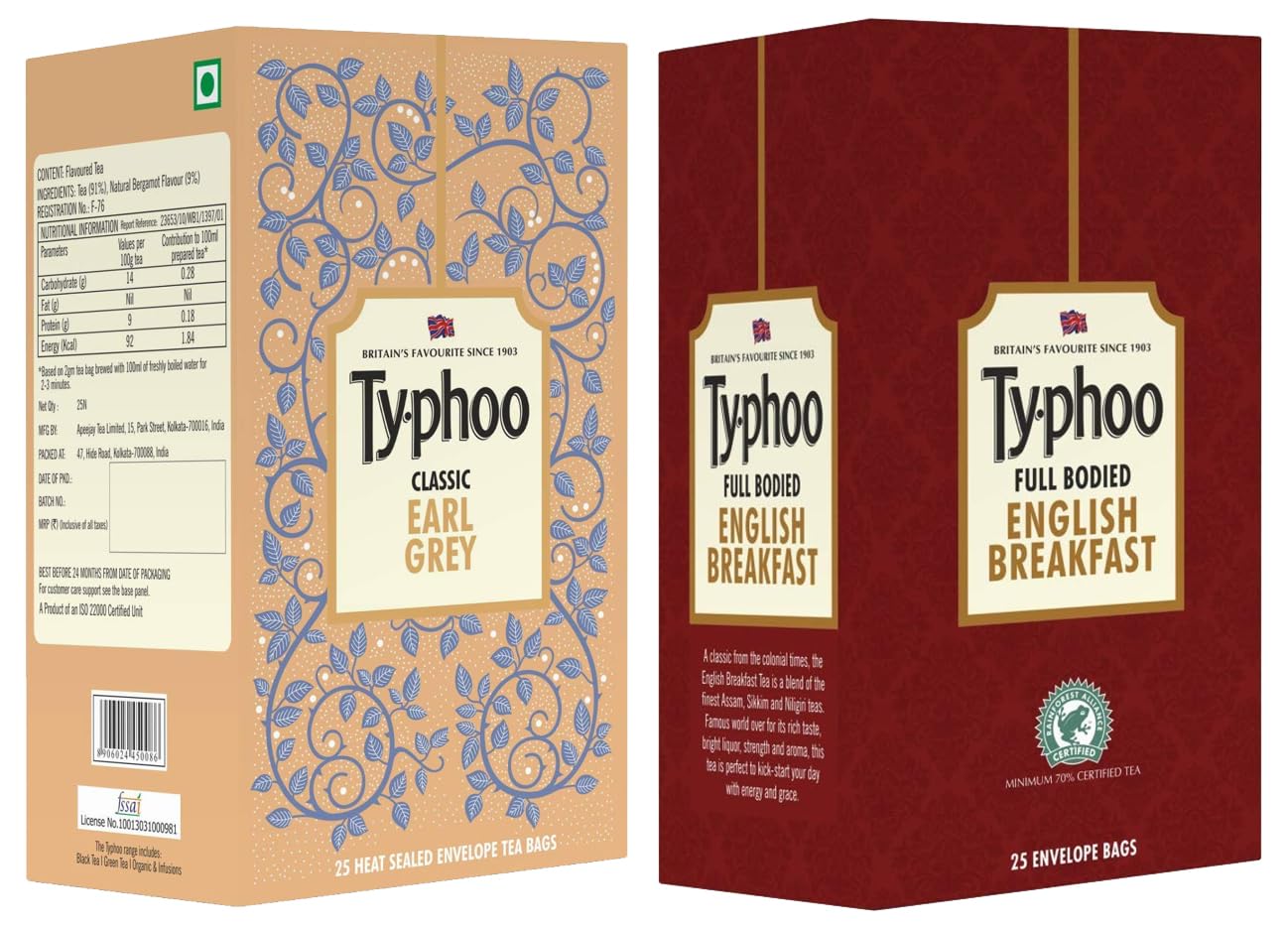 Typhoo Luxurious Flavoured Earl Grey Tea Bags (25 Tea Bags) & Typhoo Distinctive English Breakfast Black Tea Bags (25 Tea Bags)